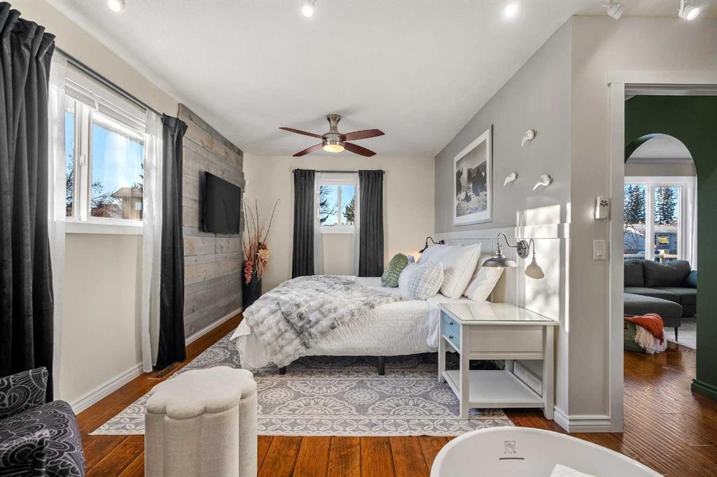 Welcome to 4636 Montana Drive NW, a meticulously maintained and thoughtfully updated 4 bedroom, 3 bathroom home on a rare oversized lot in the highly sought-after NW Calgary community of Montgomery, where homes on this street are rarely offered for sale. Ideally located minutes to downtown, University District, Market Mall, Foothills Hospital, and Alberta Children’s Hospital. The main level offers a spacious living room that flows naturally into the dining area, which features an electric fireplace, creating a warm and functional layout for everyday living and entertaining. The kitchen is a true highlight of the home, thoughtfully designed for both function and connection. It features quartz countertops, a large custom island, built-in bench seating, upgraded appliances including a gas stove, and excellent flow directly into the sunroom. The sunroom offers additional flexible living space with large windows, wood ceiling detailing, and a natural gas fireplace, creating a bright and comfortable extension of the main floor. Two generous bedrooms on this level provide excellent flexibility, including a spacious primary retreat with a beautifully renovated five-piece ensuite. The second bedroom has been thoughtfully reimagined as an expansive custom walk-in dressing room connected to the ensuite, creating a boutique-style primary retreat, while still offering the flexibility to function as a secondary bedroom if desired, and is conveniently located near the four-piece main bathroom featuring a jetted tub. The fully developed lower level adds significant flexibility. A large family room offers generous space for movie nights, games, or a second living area. Two additional well-sized bedrooms are complemented by a thoughtfully designed bathroom with a private vanity room and a separate enclosed shower. A spacious laundry area and ample storage complete the level. The outdoor space is equally impressive. A long paved driveway, rear RV parking, and a fully fenced yard provide exceptional usability of the lot. Mature trees and established landscaping create a sense of privacy and permanence. A two-person Spaberry hot tub and large poly shed are included. Two heated garages and further enhance the functionality of the property. The newer 24’x33’ oversized rear garage is fully insulated and heated and offers excellent space for parking, workshop use, hobbies, or organized storage, including metal shelving. The second 16’x24’ heated garage is currently set up as a gym and provides additional flexible space depending on lifestyle needs. This dual-garage setup is a rare offering. Additional features include air conditioning, on-demand hot water system, water softener, security system, and thoughtful storage throughout. Backing onto green space and within walking distance to an off-leash park, playgrounds, shops, restaurants, and everyday amenities, this property offers space, character, and flexibility in one of NW Calgary’s most desirable communities.