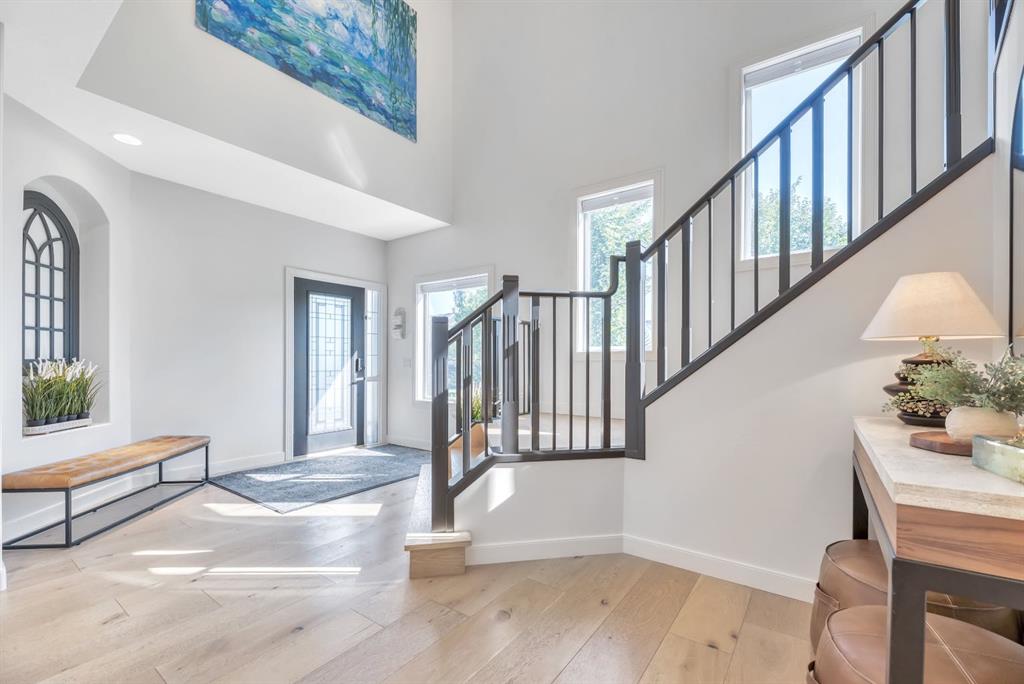 Step through the front door into a bright, airy foyer with soaring ceilings and a dramatic staircase that immediately draws you in. The open-concept main floor is bathed in natural light from oversized windows, showcasing beautiful wide-plank white oak hardwood floors and thoughtful designer touches throughout.