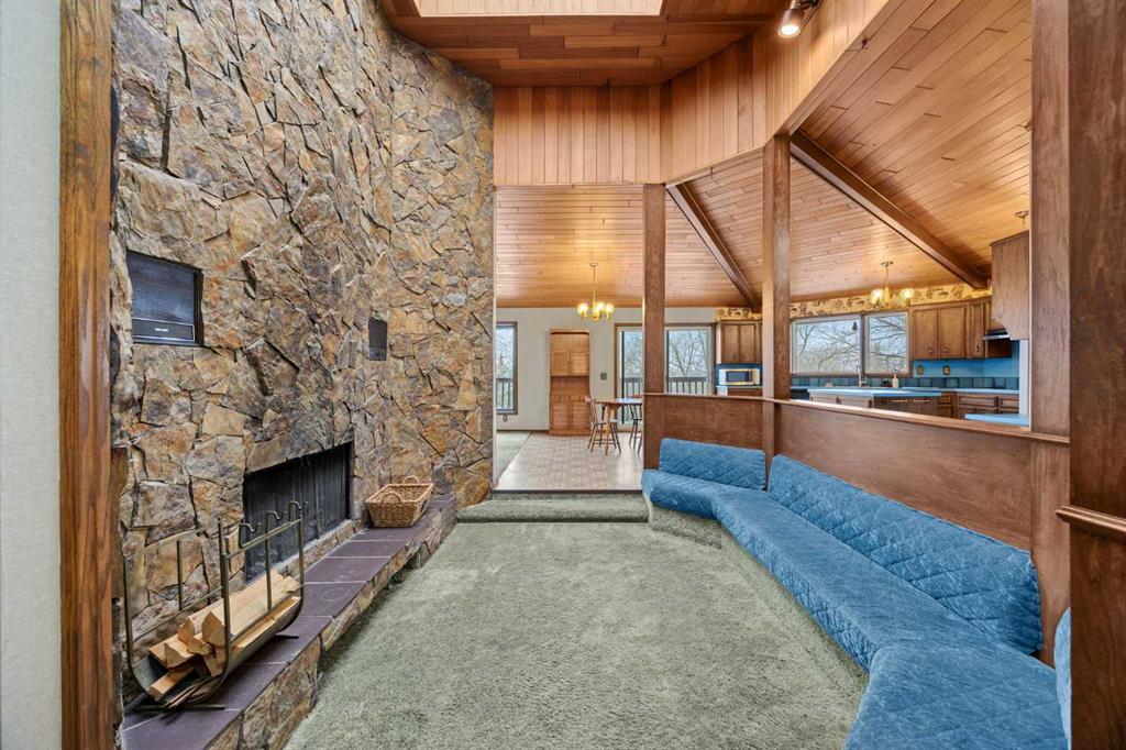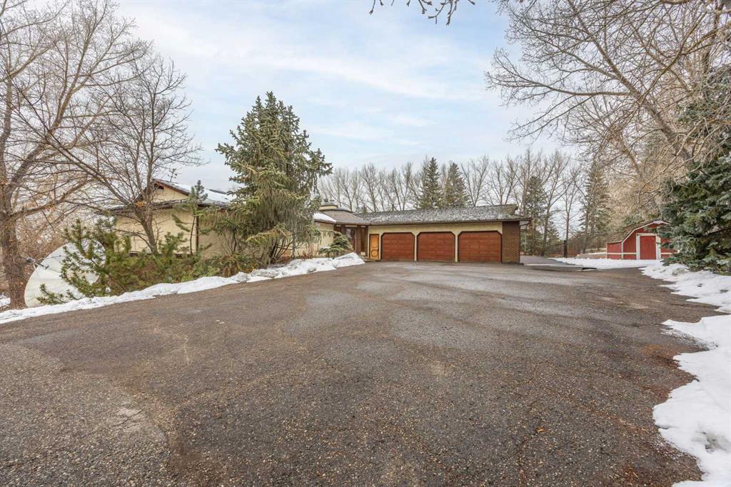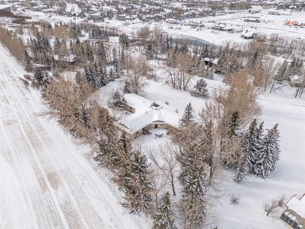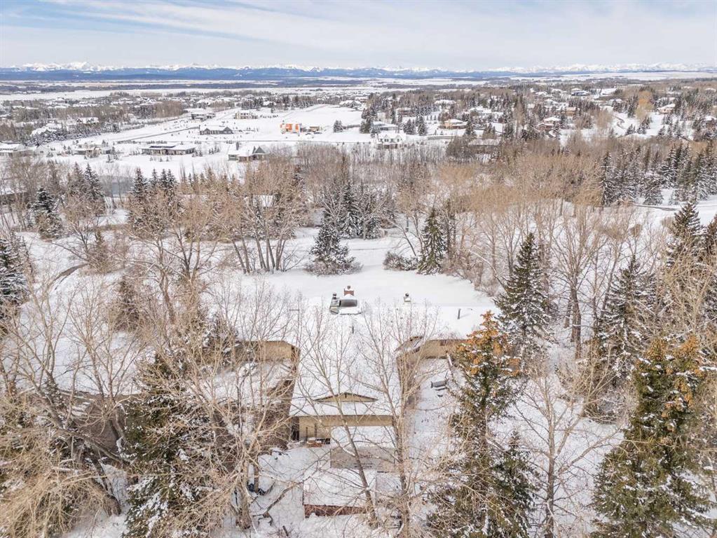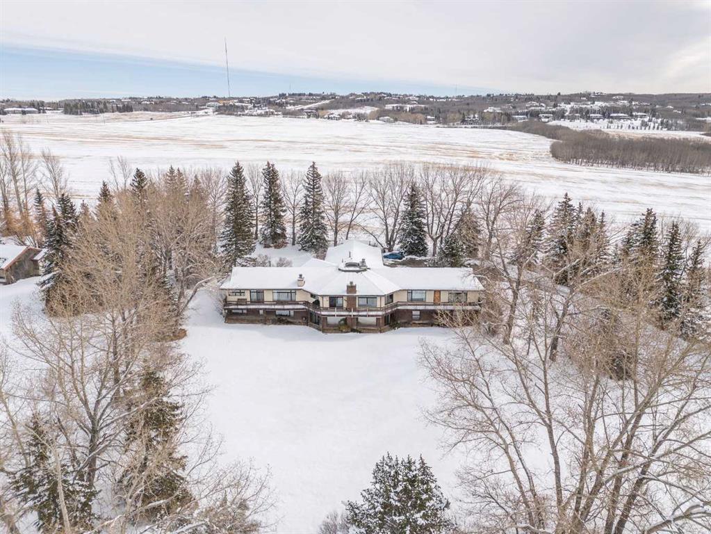 **OPEN HOUSE – SATURDAY 11-1pm** Perfectly positioned on one of Central Springbank’s most desirable streets, this property is offered for sale for the first time. Set on 2.13 hillside acres, it offers expansive west-facing views of the Rocky Mountain range, stunning sunsets, and starry skies at night. The home itself is suited for either a Buyer looking to undertake a renovation that can marry its unique and functional design, or a Buyer seeking a mature build site for a new custom home. This walkout bungalow offers over 3,450 square feet above grade, over 3,350 additional square feet in the walkout lower level, and an oversized 3-car attached garage of over 900 square feet, complete with a suspended gas heater. The main home features 6 bedrooms, 2 full bathrooms, and a powder room, with the upper level offering 3 bedrooms, a formal dining room, kitchen, and living room all anchored around a conversation pit with natural-stone fireplace. The lower level of the main home includes 3 additional bedrooms, a full bathroom, rec space, and more. The private north-wing in-law/nanny suite offers excellent flexibility for multigenerational living, with 1 bedroom and 1 full bathroom above grade, plus 2 additional bedrooms and 1 full bathroom on the lower level. Three of the home’s four wood-burning fireplaces feature natural stone and gas assist. Listed at land value, this is a rare opportunity to buy in Central Springbank where you are only 5 minutes to Calgary’s westside amenities, the Ring Road, and schools, or 45 minutes to Canmore. It is extremely rare to find a property like this with no main-road noise exposure, on a no-through street, with trees, privacy, and mountain views.