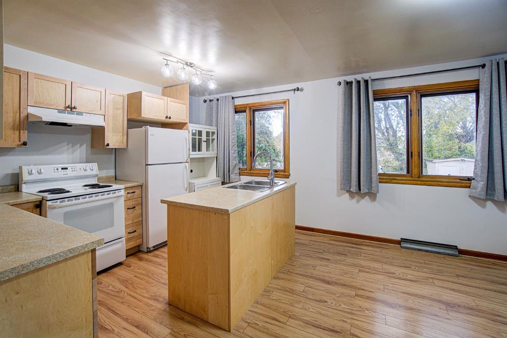 Welcome to your ideal bungalow! Just a few blocks from downtown, this charming home combines classic character with thoughtful updates. Step inside to a bright and spacious living room highlighted by a large east-facing picture window and stunning original hardwood floors that flow through much of the main level. The renovated kitchen offers plenty of function and style, featuring a center island with sink and an adjoining dining area perfect for family meals or entertaining. Two generously sized bedrooms and a 4-piece bathroom complete the main floor. Conveniently located off the back entrance, the laundry area boasts an abundance of cabinets, folding counters, and space for a stand-up freezer. Downstairs, you’ll find a mostly finished basement with plenty of storage, workshop area, a cozy rec room, additional good-sized bedrooms, and an oversized 4-piece bathroom complete with a large tub. Outside, the backyard is full of potential with room for a garden, outdoor toys, or future projects. Side alley access and a single carport add to the functionality of this property. This is a wonderful opportunity to own a well-cared-for home with both charm and possibilities!