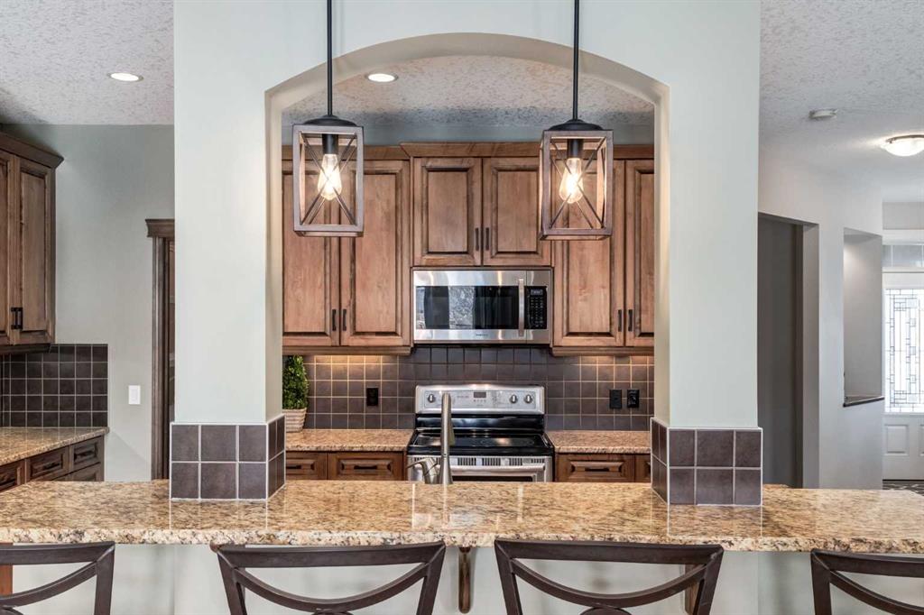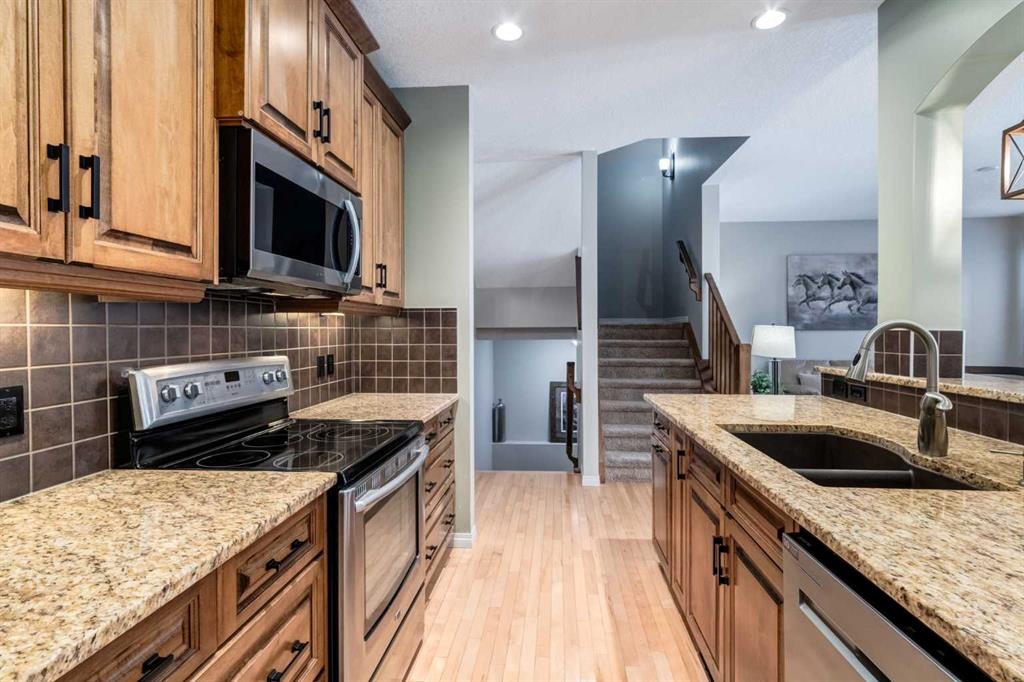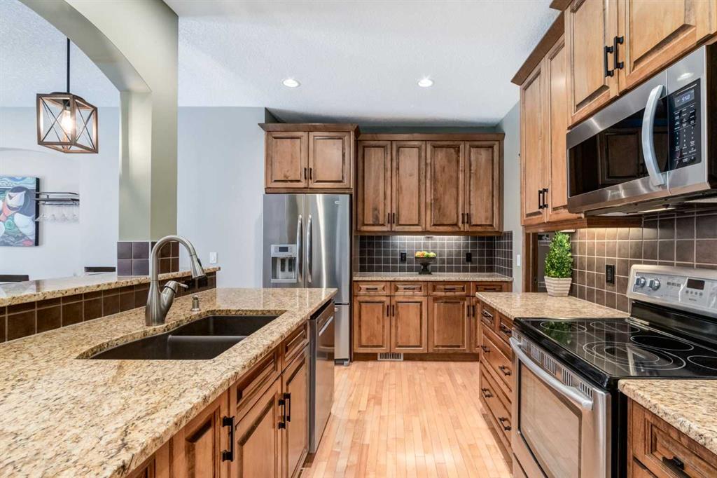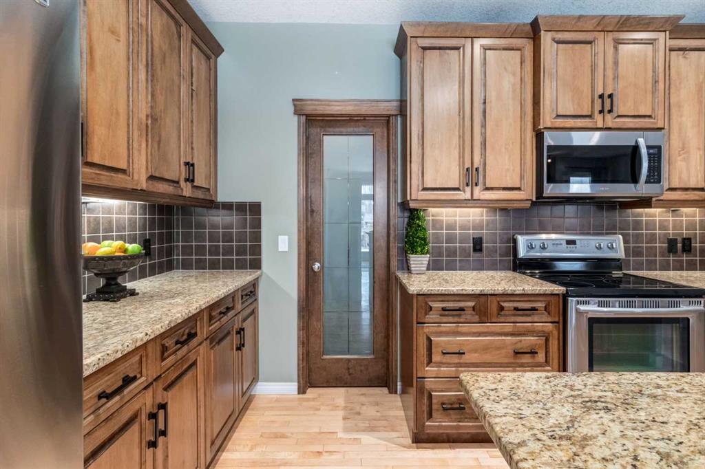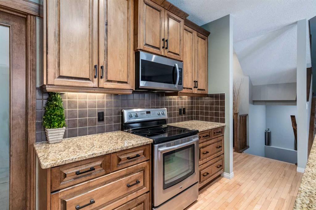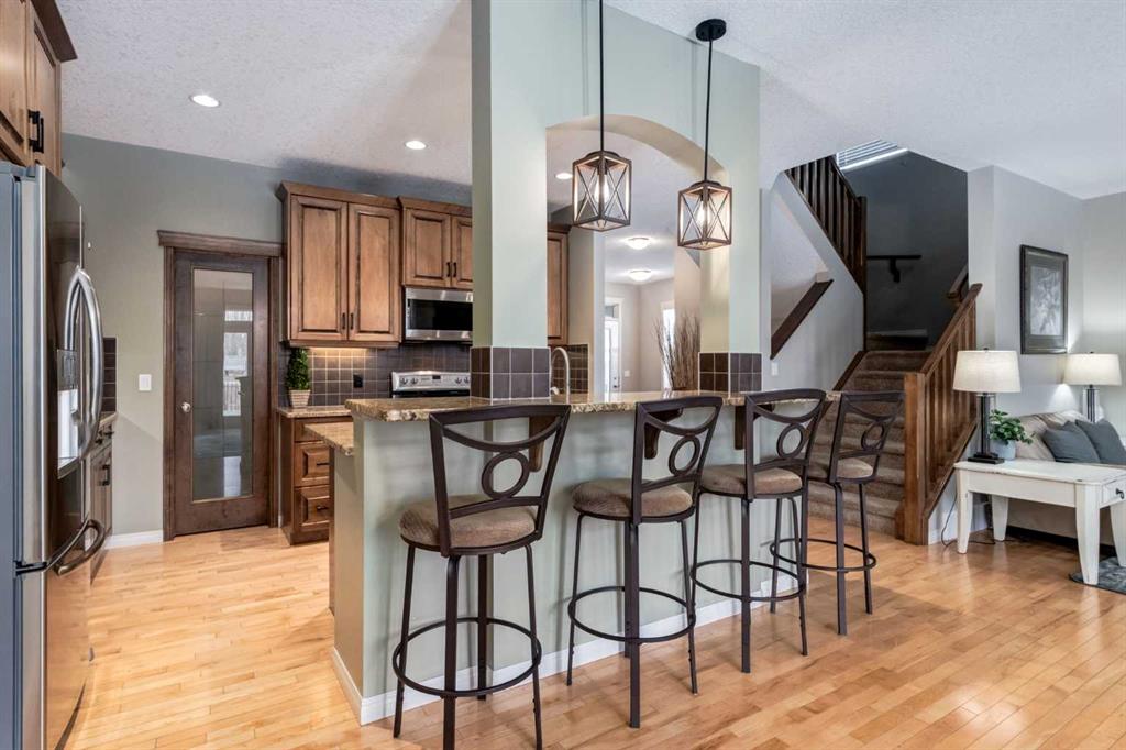Inside, the main floor features hardwood and tile flooring throughout, creating a clean and durable living space. The inviting living room is centered around a cozy gas fireplace, while the upgraded kitchen showcases full wood cabinet doors, granite countertops, and walk-in pantry — perfect for hosting family and friends.