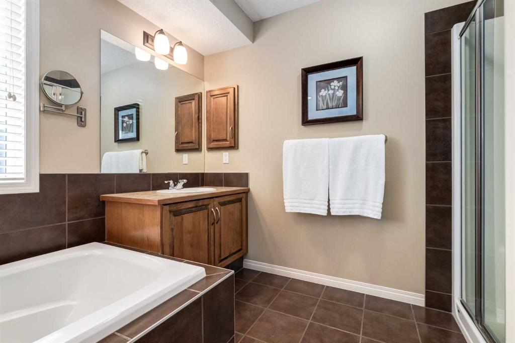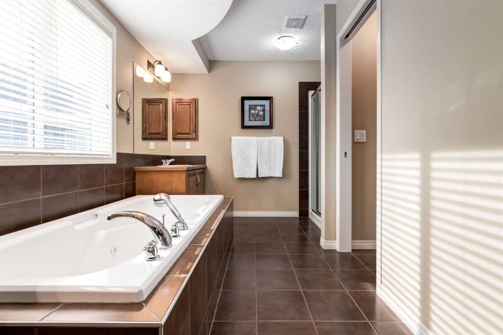 Upstairs, the spacious master bedroom includes an ensuite that features a double vanity and jetted soaker tub, and a large WIC w/ a built-in closet organizer, providing a comfortable and functional space to unwind.