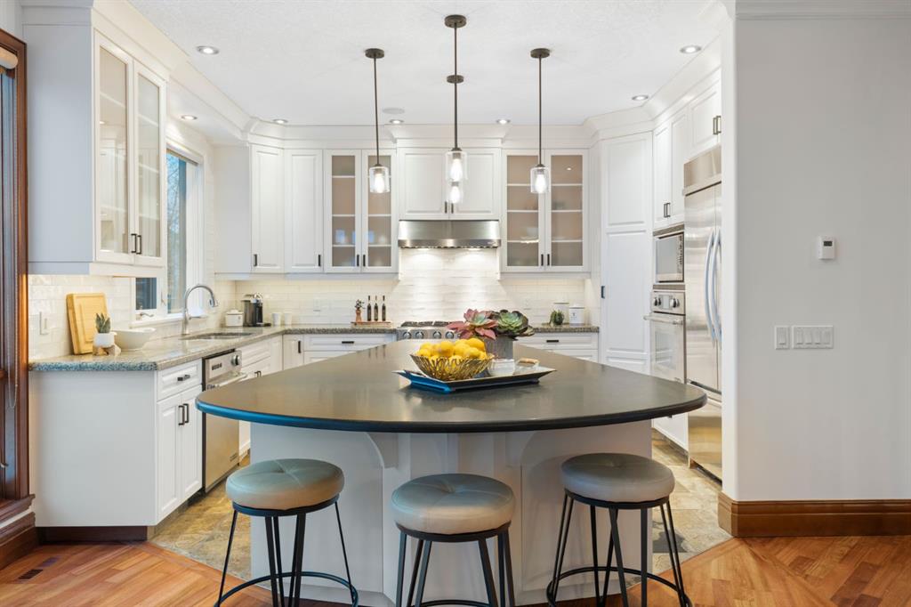 Inside, you’ll appreciate the high ceilings, large windows, and modern lighting throughout. At the heart of the home, an expansive spiral staircase serves as a stunning architectural centre piece, elegantly connecting the levels and creating a striking first impression the moment you step inside. The stylish white kitchen, renovated in 2017, is designed for both everyday living and entertaining. It features two-toned quartz countertops, stainless steel appliances, a gas stove, under-cabinet lighting, and a corner pantry for added storage. The main floor features hardwood flooring, a dedicated home office, and a functional walk-through locker-style closet accessible from both the front entry and garage — ideal for busy families. The spacious main floor laundry room includes a sink, cabinetry, and built-in smart storage solutions, including an ironing board.
