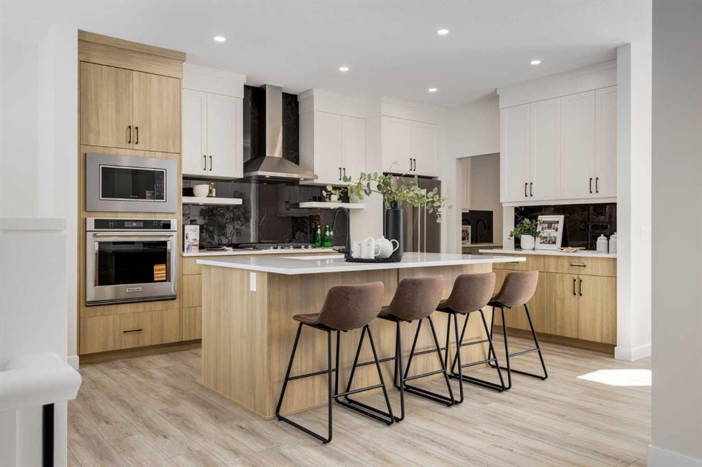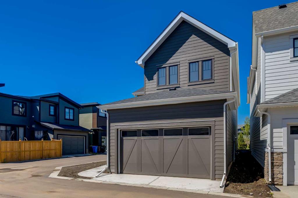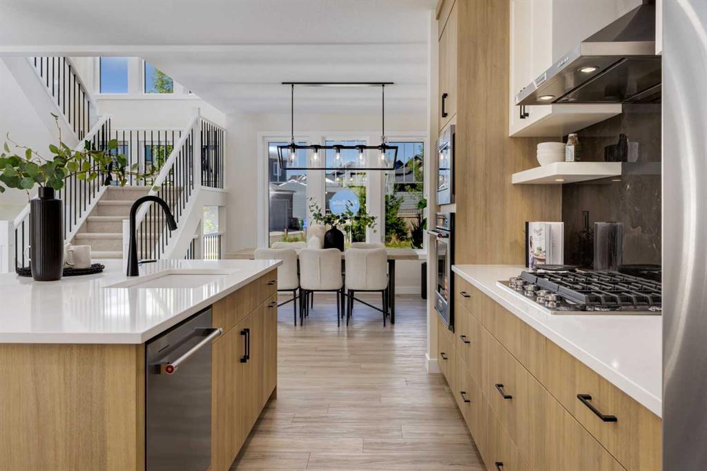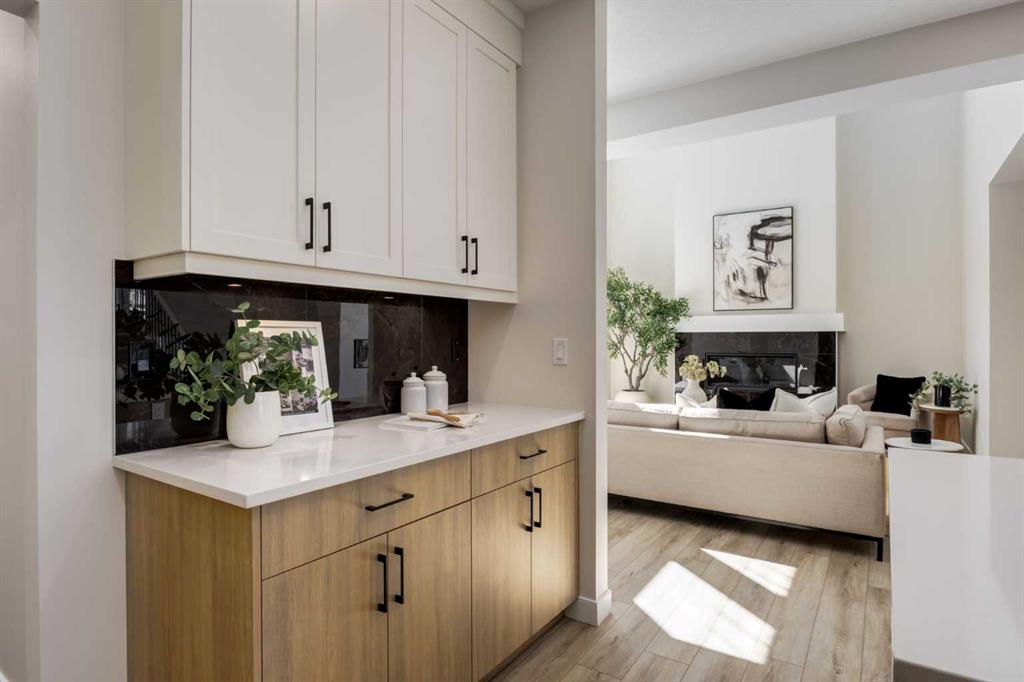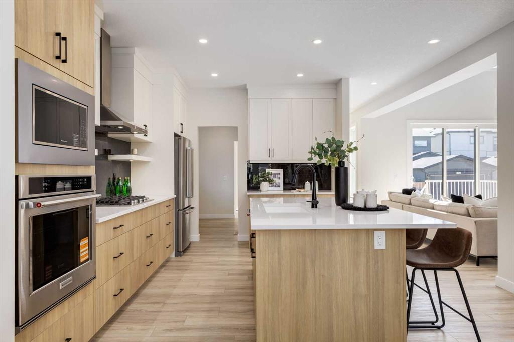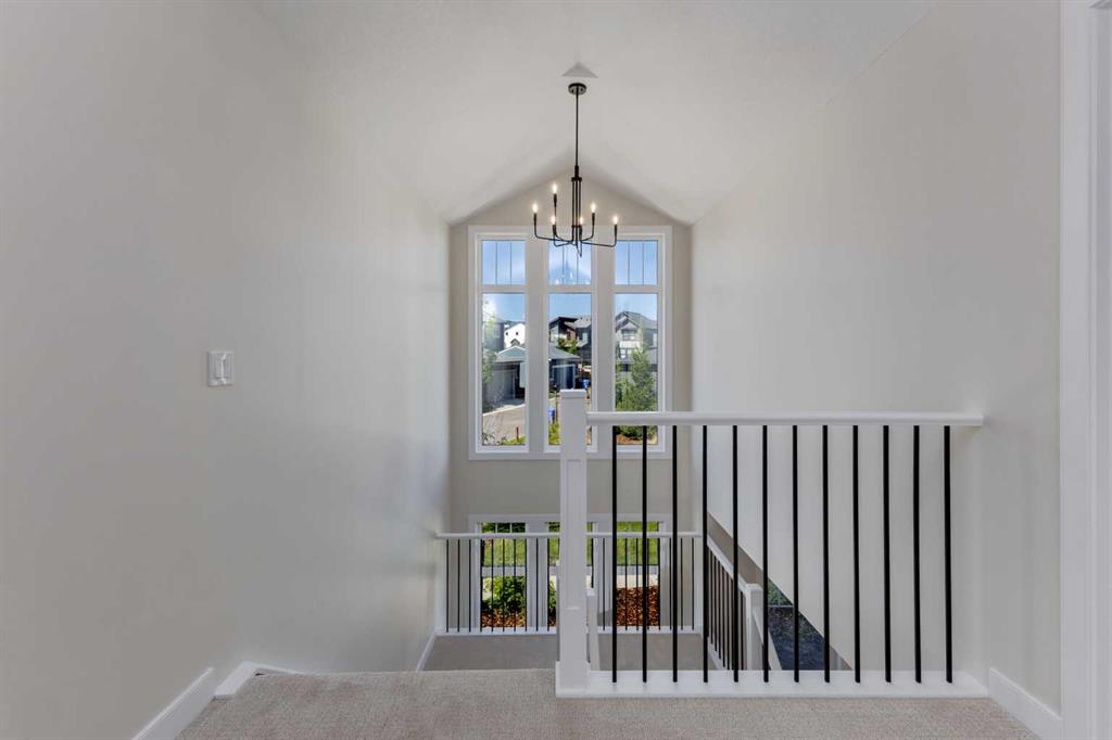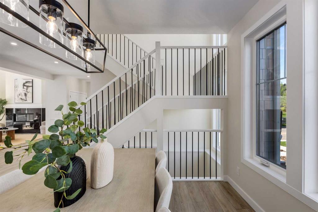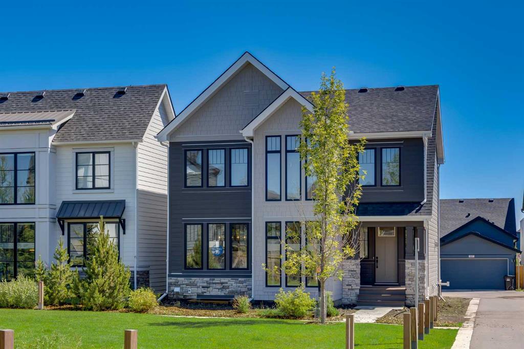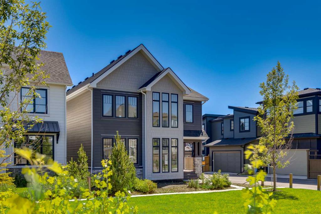 Welcome to the Engler, an architectural two-storey that pairs standout design with day-to-day function, set in a prime front-facing position on Hearth Green. With the park right out front, you’ll love having a natural gathering place for kids to run, neighbours to connect, or a quiet evening by the community firepit. Inside, the home makes an immediate impression with an open-concept plan filled with natural light, soaring two-storey windows, and a dramatic floating staircase with open black railing that keeps sightlines wide and the vibe airy. The kitchen is the true centrepiece, equal parts beautiful and practical, finished with two-tone cabinetry (white uppers raised to the ceiling and rich wood-grain lowers), crisp white quartz countertops, a white Silgranite sink, sleek black hardware, and a bold black backsplash that brings the whole look together. Cooking is a treat with a gas range plus built-in oven and microwave, while the open shelving beside the hood fan adds the perfect modern touch for styling and everyday convenience. Entertaining is effortless thanks to the full butler’s bar, complete with a sink and space for an additional fridge or freezer, ideal for hosting, family movie nights, or keeping things organized when life gets busy. The dining area is bright and welcoming with a statement light fixture and sun pouring in throughout the day, flowing seamlessly into the open-to-above living room where a modern black tile fireplace surround mirrors the kitchen finishes for a cohesive, designer feel. At the back of the home, thoughtful locker-style built-ins and generous mudroom storage keep backpacks, boots, and winter gear neatly tucked away, because real life happens here, and this home is built for it. Upstairs, the winged bedroom layout creates privacy and smart separation: the vaulted owner’s suite overlooks the backyard, while the secondary bedrooms are positioned at the front of the home. You’ll appreciate the balance of comfort and function with a spa-inspired ensuite, a spacious five-piece main bath for the kids, and a large upper laundry room that makes the daily routine smoother. The open-to-below upper hallway adds a loft-like feel and reinforces the bright, expansive atmosphere created by the home’s abundant windows. Downstairs, 9’ foundation walls offer excellent future development potential and a more open, comfortable basement feel. Outside, step onto your deck right off the patio doors, perfect for summer BBQs and morning coffee, plus enjoy the convenience of an attached double garage. Set in Alpine Park, this home is surrounded by a community built around connection: parks, pathways, and a future village centre with local shops and cafés on the way. With design inspired by Calgary’s mountain, prairie, and urban influences, Alpine Park is crafted to encourage neighbourliness, and the Engler is a perfect match for that lifestyle.