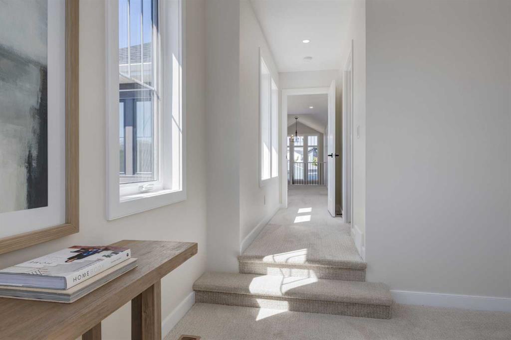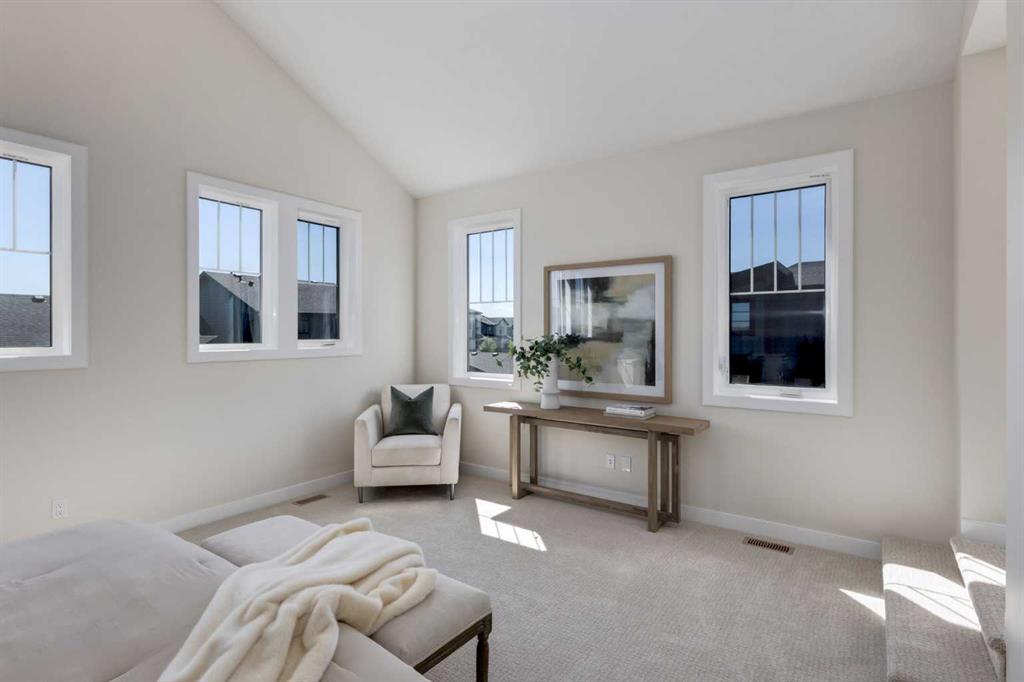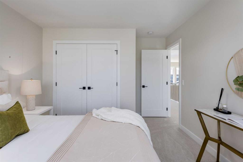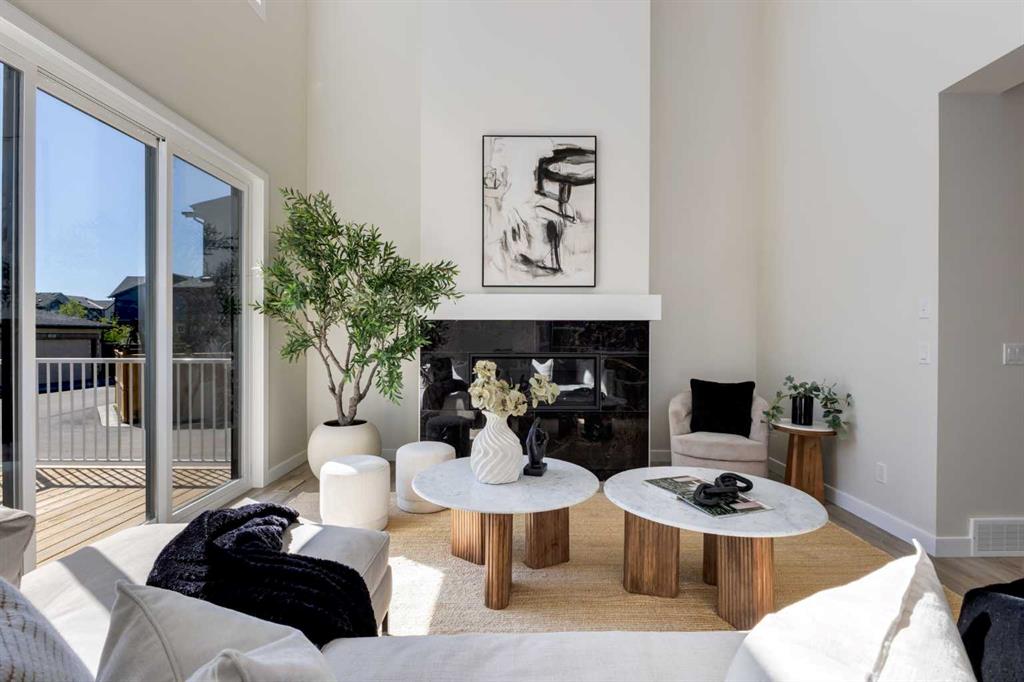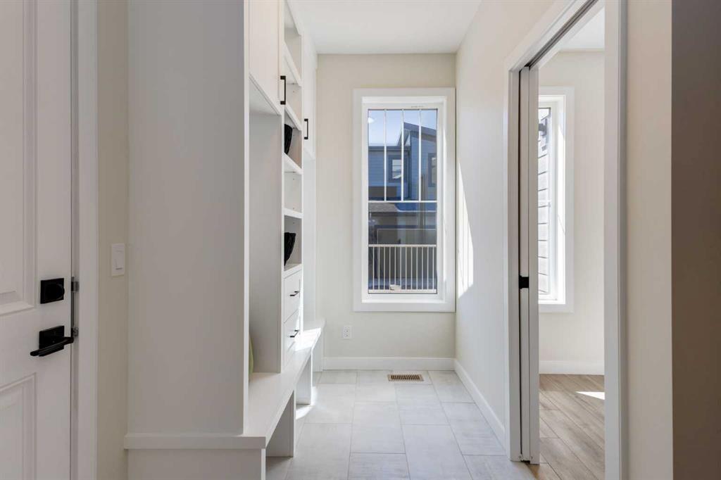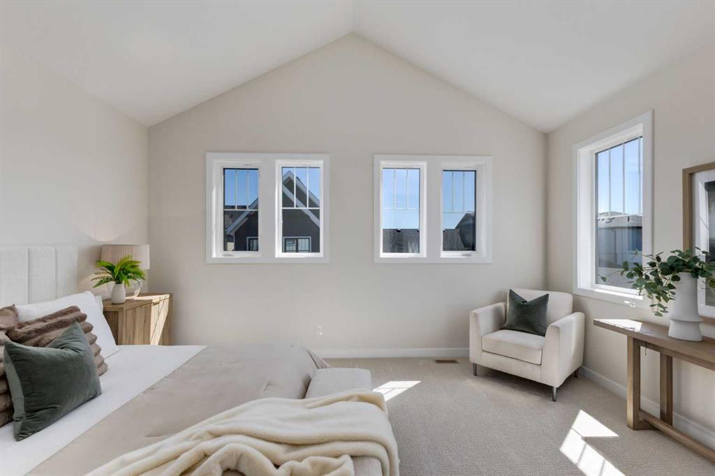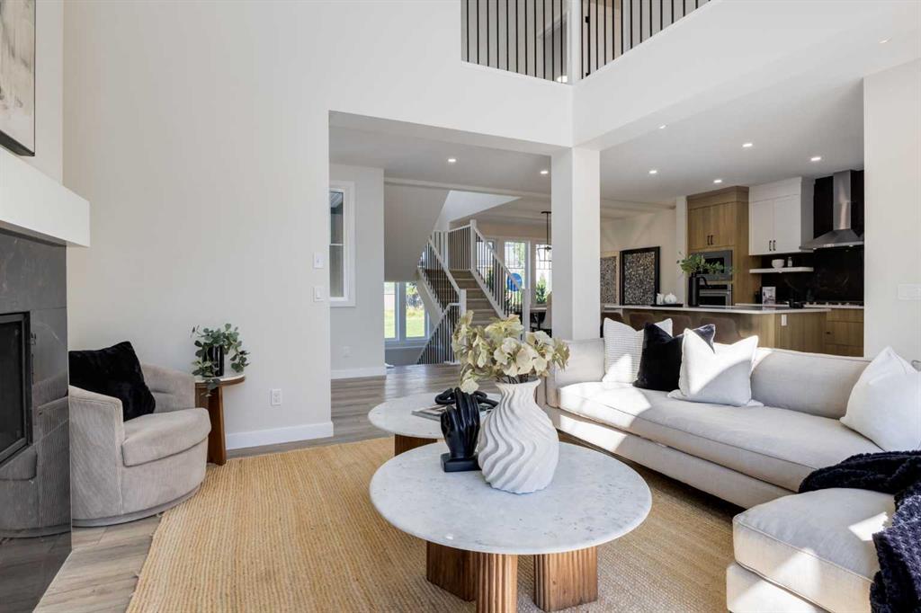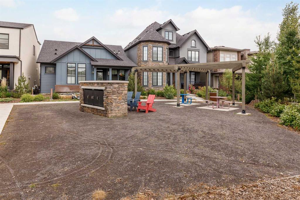 Welcome to the Engler, an architectural two-storey that pairs standout design with day-to-day function, set in a prime front-facing position on Hearth Green. With the park right out front, you’ll love having a natural gathering place for kids to run, neighbours to connect, or a quiet evening by the community firepit. Inside, the home makes an immediate impression with an open-concept plan filled with natural light, soaring two-storey windows, and a dramatic floating staircase with open black railing that keeps sightlines wide and the vibe airy. The kitchen is the true centrepiece, equal parts beautiful and practical, finished with two-tone cabinetry (white uppers raised to the ceiling and rich wood-grain lowers), crisp white quartz countertops, a white Silgranite sink, sleek black hardware, and a bold black backsplash that brings the whole look together. Cooking is a treat with a gas range plus built-in oven and microwave, while the open shelving beside the hood fan adds the perfect modern touch for styling and everyday convenience. Entertaining is effortless thanks to the full butler’s bar, complete with a sink and space for an additional fridge or freezer, ideal for hosting, family movie nights, or keeping things organized when life gets busy. The dining area is bright and welcoming with a statement light fixture and sun pouring in throughout the day, flowing seamlessly into the open-to-above living room where a modern black tile fireplace surround mirrors the kitchen finishes for a cohesive, designer feel. At the back of the home, thoughtful locker-style built-ins and generous mudroom storage keep backpacks, boots, and winter gear neatly tucked away, because real life happens here, and this home is built for it. Upstairs, the winged bedroom layout creates privacy and smart separation: the vaulted owner’s suite overlooks the backyard, while the secondary bedrooms are positioned at the front of the home. You’ll appreciate the balance of comfort and function with a spa-inspired ensuite, a spacious five-piece main bath for the kids, and a large upper laundry room that makes the daily routine smoother. The open-to-below upper hallway adds a loft-like feel and reinforces the bright, expansive atmosphere created by the home’s abundant windows. Downstairs, 9’ foundation walls offer excellent future development potential and a more open, comfortable basement feel. Outside, step onto your deck right off the patio doors, perfect for summer BBQs and morning coffee, plus enjoy the convenience of an attached double garage. Set in Alpine Park, this home is surrounded by a community built around connection: parks, pathways, and a future village centre with local shops and cafés on the way. With design inspired by Calgary’s mountain, prairie, and urban influences, Alpine Park is crafted to encourage neighbourliness, and the Engler is a perfect match for that lifestyle.