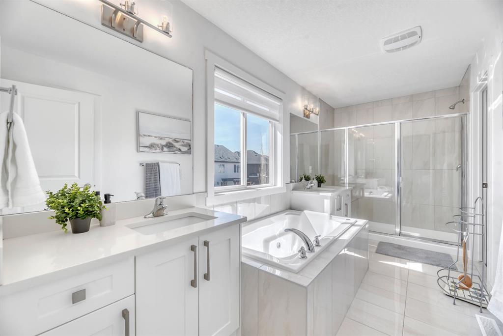 Welcome to this stunning semi-estate home in the highly sought-after community of Legacy—where style, space, and functionality come together to create the perfect family home. From the moment you walk through the front door, you’ll be impressed by the bright, airy feel and exceptional attention to detail throughout this immaculate 2,393 sq ft residence. Flooded with natural light, the main floor offers a spacious and thoughtfully designed layout ideal for both everyday living and entertaining. The chef-inspired kitchen features crisp white cabinetry, quartz countertops, a gas cooktop, built-in wall oven and microwave, and a convenient walk-through pantry that seamlessly connects to the open mudroom/front entry. Very cohesive and large family friendly design! The open-concept living and dining areas create a welcoming space for gatherings, all enhanced by the home’s clean, modern aesthetic. Upstairs, you’ll find an incredible layout with four generously sized bedrooms and a massive central bonus room, perfect for family movie nights or a kids’ retreat. The primary suite is truly a standout—offering an expansive bedroom, a luxurious 5-piece ensuite complete with dual vanities, a jetted soaker tub, and an oversized shower. The walk-in closet conveniently connects through to the laundry room, which includes a wash sink for added functionality.