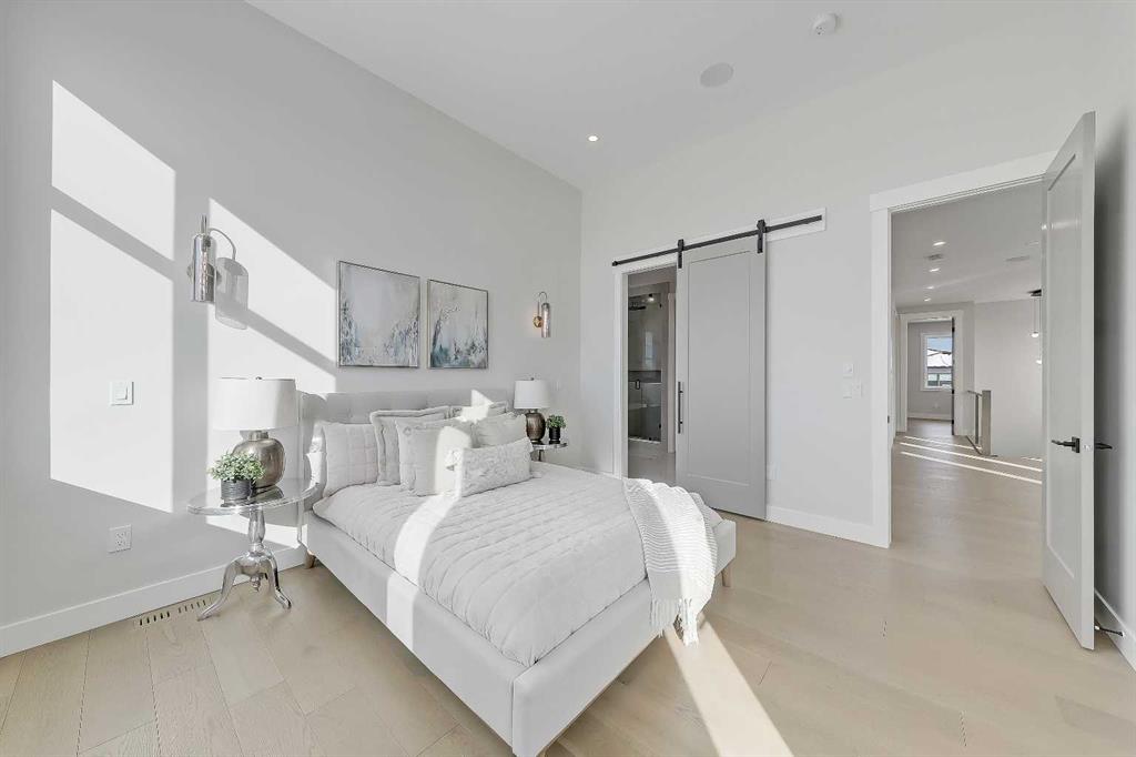 Upstairs, a central bonus room anchors the bedrooms. The primary retreat offers an 11-ft ceiling, private balcony with DOWNTOWN VIEWS, boutique-style walk-in closet, and a spa-inspired ensuite with heated floors, dual vanities, freestanding soaker tub, and STEAM shower. Two additional bedrooms include walk-in closets and private 4-pc ensuites. A fully appointed laundry room adds practical convenience.