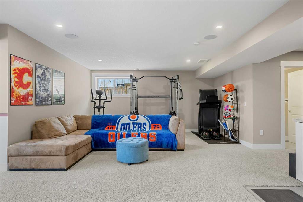 The fully finished basement further expands the living space and provides exceptional versatility for modern family living. This level features a generous recreation area well suited for a media room, games area, or additional family lounge. Whether used for entertaining, relaxing, or creating a dedicated fitness or hobby space, the lower level adds valuable square footage while maintaining practical storage options.