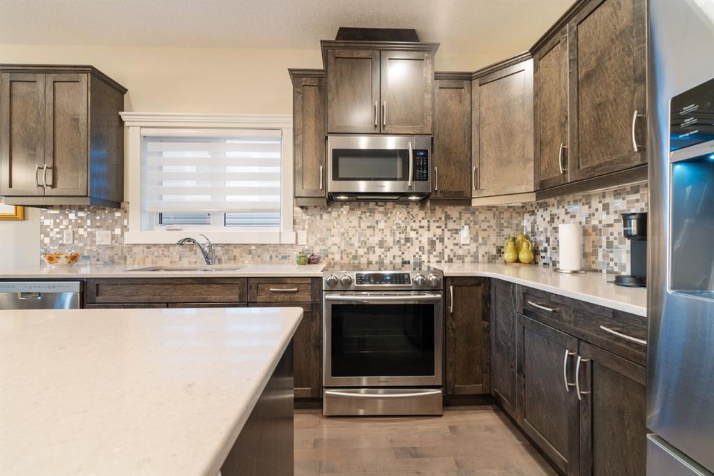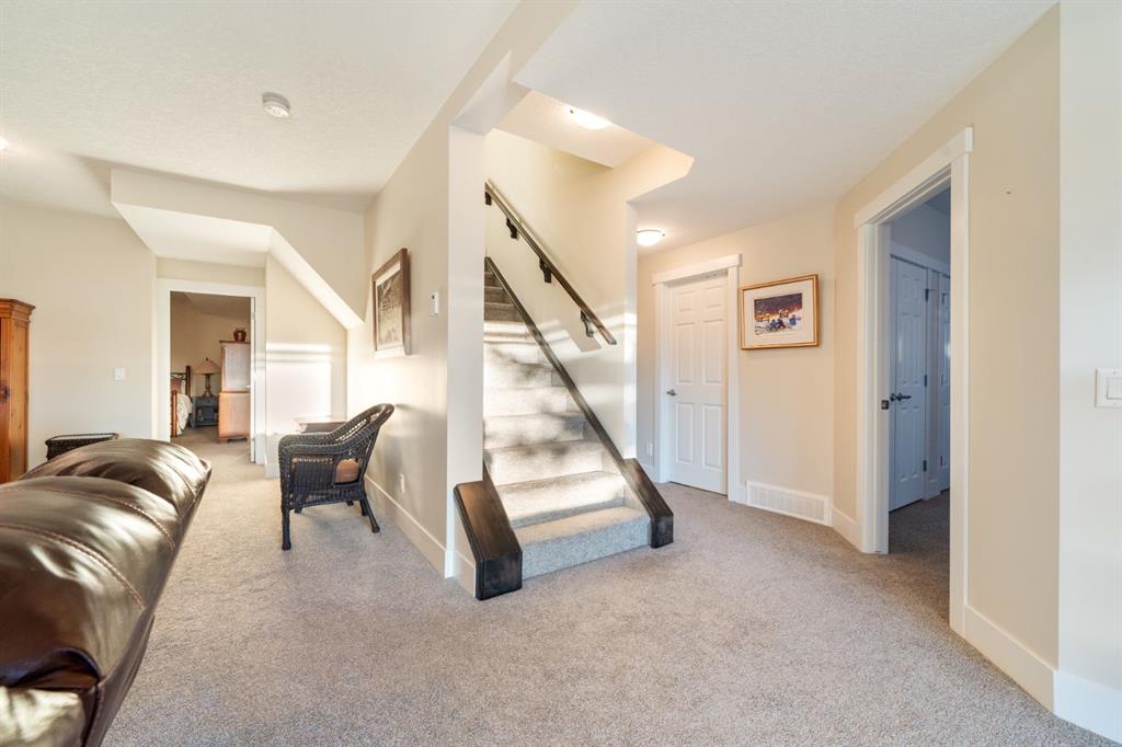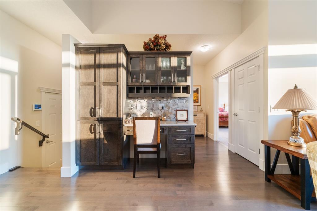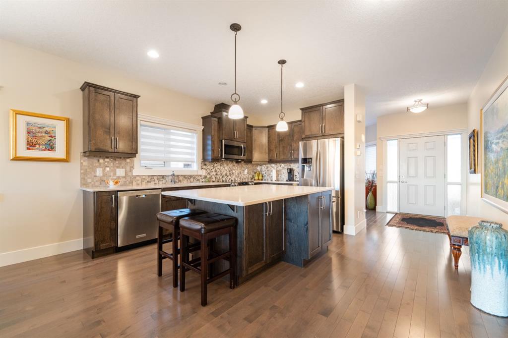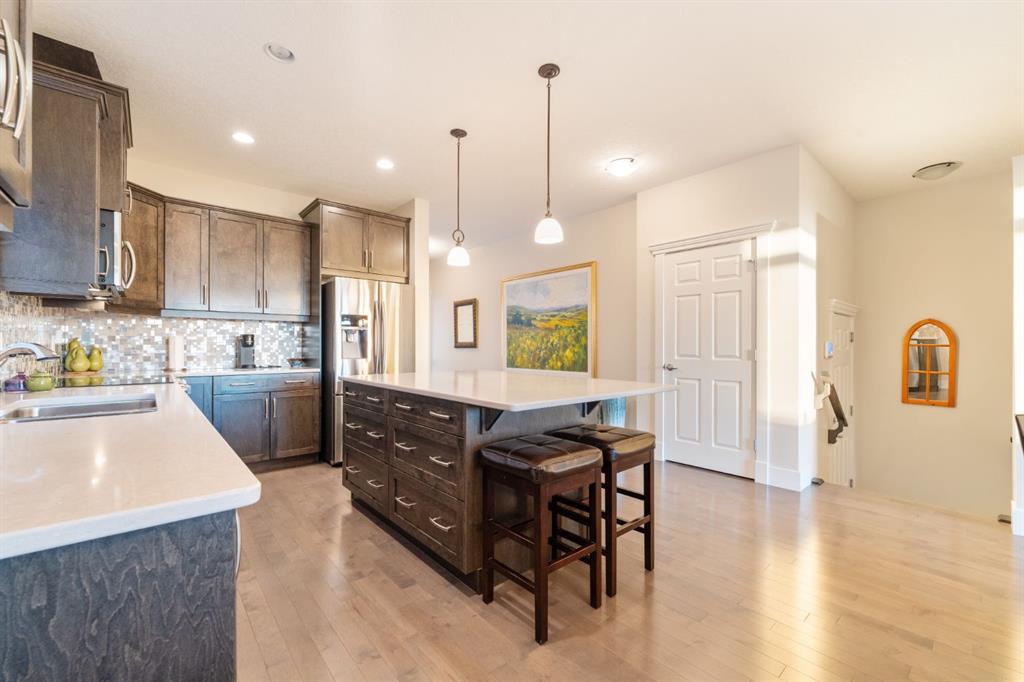 Welcome to 491 Rocky Vista Gardens NW, a well-kept bungalow villa townhouse located in the desirable community of Rocky Ridge. Built in 2016 and one of the newer units in the complex, this home offers comfortable, low-maintenance living with thoughtful upgrades and outstanding mountain views. The main floor features an open layout with vaulted ceilings over the kitchen and family room, creating a bright and spacious feel. The kitchen includes designer cabinetry, stone countertops, and stainless steel appliances, and opens nicely to the dining and living areas—ideal for everyday living and casual entertaining. Hardwood flooring runs through most of the main level, along with built-in cabinetry that adds both storage and character. At the front of the home is a flexible room that works well as a home office, TV room, study, or formal dining space. The primary bedroom is a comfortable retreat with mountain views, a 4 piece ensuite, and his-and-hers closets.