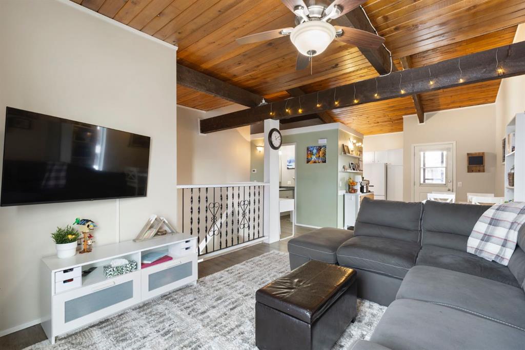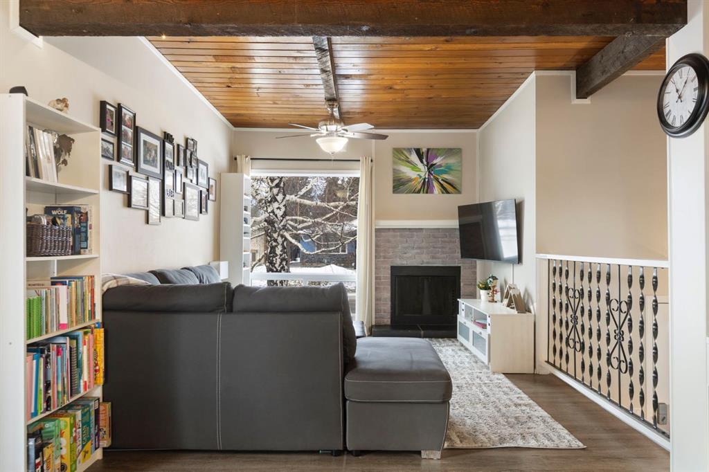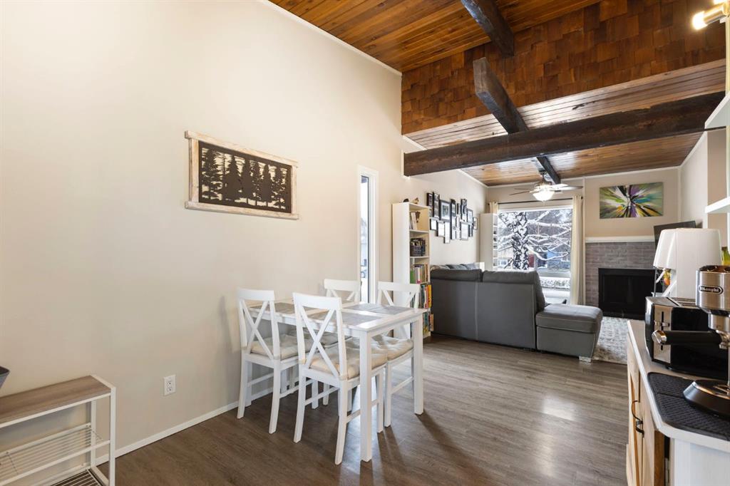 This well-maintained corner unit offers a comfortable and efficient layout with approximately 1,002 square feet of developed living space across two levels. The main floor features a welcoming living room highlighted by exposed wood beams and a wood-burning fireplace, offered as-is, creating a warm and inviting atmosphere. Fresh paint and updated vinyl plank flooring add a modern touch throughout the space.