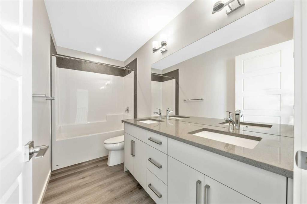 Welcome to this Bedrock Homes quick possession, ideally located on a premium corner lot in the vibrant Heartwood community of SE Calgary. Offering over 2,500 sq ft of thoughtfully designed living space, this home features a central flex room perfect for a home office or guest area, and a striking open-to-below staircase that fills the home with natural light. The chef’s kitchen is equipped with built-in microwave, chimney hood fan, and a large island that opens to the dining area and great room—ideal for entertaining. A 50” electric fireplace adds warmth and style, while metal spindle railings and custom melamine shelving elevate the finish throughout. Upstairs, enjoy a spacious bonus room and retreat to the luxurious primary bedroom featuring a freestanding tub, tiled shower, dual sinks, and private water closet. Complete with a walk-through mudroom and pantry and double attached garage, this home offers exceptional comfort, design, and location close to amenities and parks. Photos are representative.