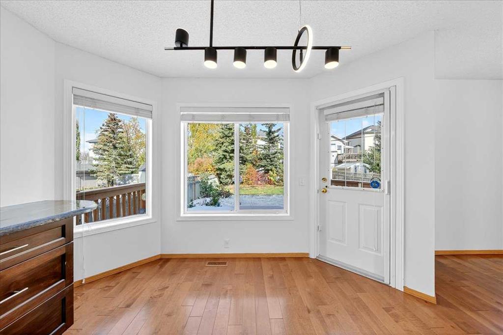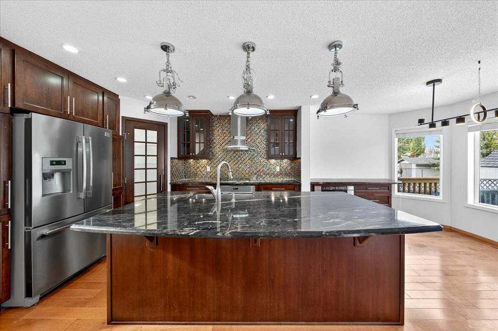 Welcome to this exceptionally well-maintained and recently upgraded family home located on a quiet street in the desirable community of Citadel. With over 3,200 sq ft of developed living space, this 2-storey home features 3 bedrooms up, a fully finished basement, and numerous recent updates throughout. Main floor offers a formal living/dining area, private den/office with French doors, cozy family room with gas fireplace, and a beautifully upgraded kitchen with wood cabinetry, granite counters, large island, built-in server with drawer microwave, pull-out pantry & garbage, brand new gas cooktop, and stainless steel appliances. A bright breakfast nook leads to the large deck and landscaped backyard. Hardwood floors run throughout the main level. Upper floor features new hardwood flooring, a convenient laundry room with new tile, two spacious bedrooms, and a fully renovated 4-piece bathroom. The primary suite offers a walk-in closet and a newly renovated stunning 5-piece ensuite with soaker tub, separate shower, quartz counters, undermount sinks, new faucets, New lighting, one-piece toilet, and updated tile flooring. The fully finished basement includes a huge rec room with second gas fireplace, wet bar, fitness area, 3-piece bath with wall-mounted electric heater, and a Bedroom.