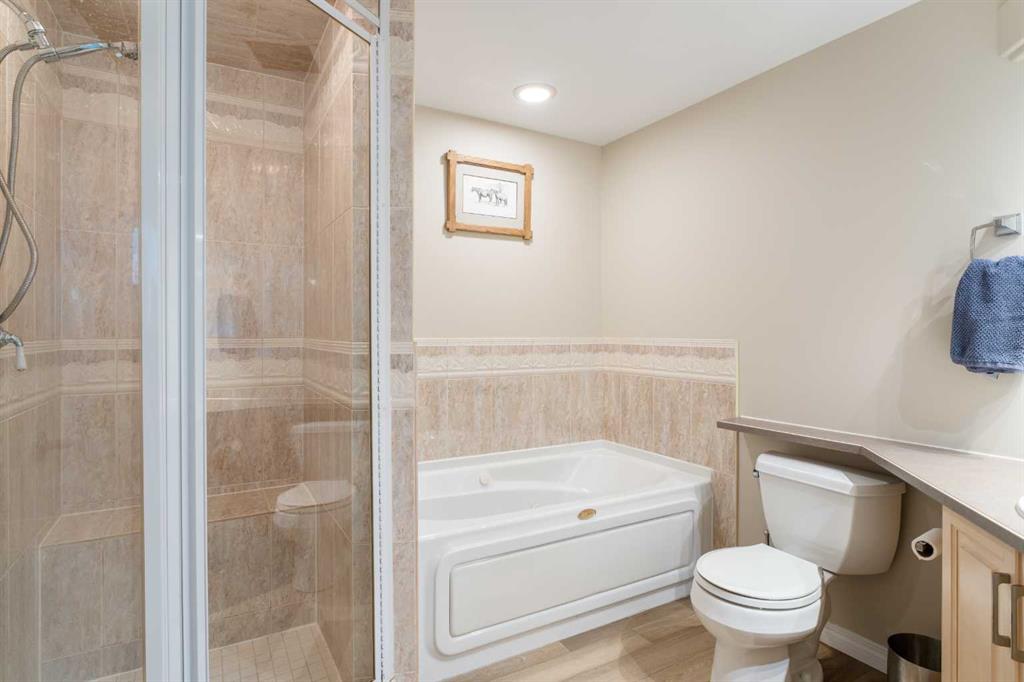 The refined primary suite is your private retreat — featuring a cozy gas fireplace, a walk-in closet with custom built-ins, private balcony access, and a spa-inspired 5-piece ensuite with dual vanities, a jetted soaker tub, and the newly renovated glass-enclosed shower.
