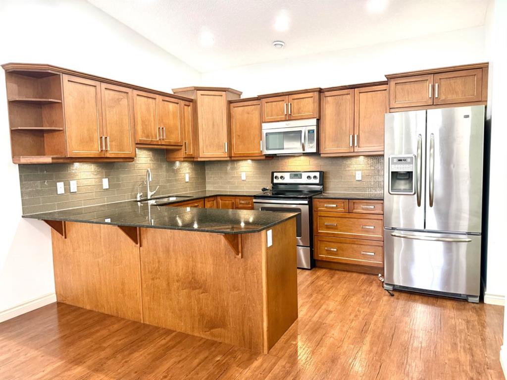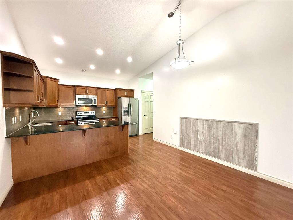 Welcome to this beautifully maintained 3-bedroom villa in the sought-after Sunrise Heights Villas in High River. This rare corner unit is one of the largest in the complex and offers desirable west-facing exposure, filling the home with natural light throughout the day. The two west facing windows are complimented with exterior mounted shades. Step inside to discover a bright and open floor plan featuring vaulted ceilings and in-floor heating for year-round comfort. The spacious kitchen and dining area flow seamlessly together, showcasing an abundance of oversized cabinetry, granite countertops, tile backsplash, and a generous walk-in pantry—perfect for both everyday living and entertaining. The living and dining areas are warm and inviting, highlighted by large west-facing windows. The thoughtfully designed layout offers privacy, with the bedrooms tucked away from the main living space. The primary suite is generously sized and features his-and-hers closets along with a well-appointed ensuite complete with double sinks and a large walk-in shower. Two additional bedrooms provide flexibility for guests, a home office, or den. This home offers exceptional storage throughout, including a spacious side entry from the garage with convenient, tucked-away laundry. The oversized double attached garage also includes extra storage space, which is ideal for additional parking or workshop space. Enjoy sunny afternoons on the charming front patio, and take advantage of the close proximity to walking pathways and local shops. Located in a quiet adult living complex, this home offers comfort, convenience, and low-maintenance living at its finest.