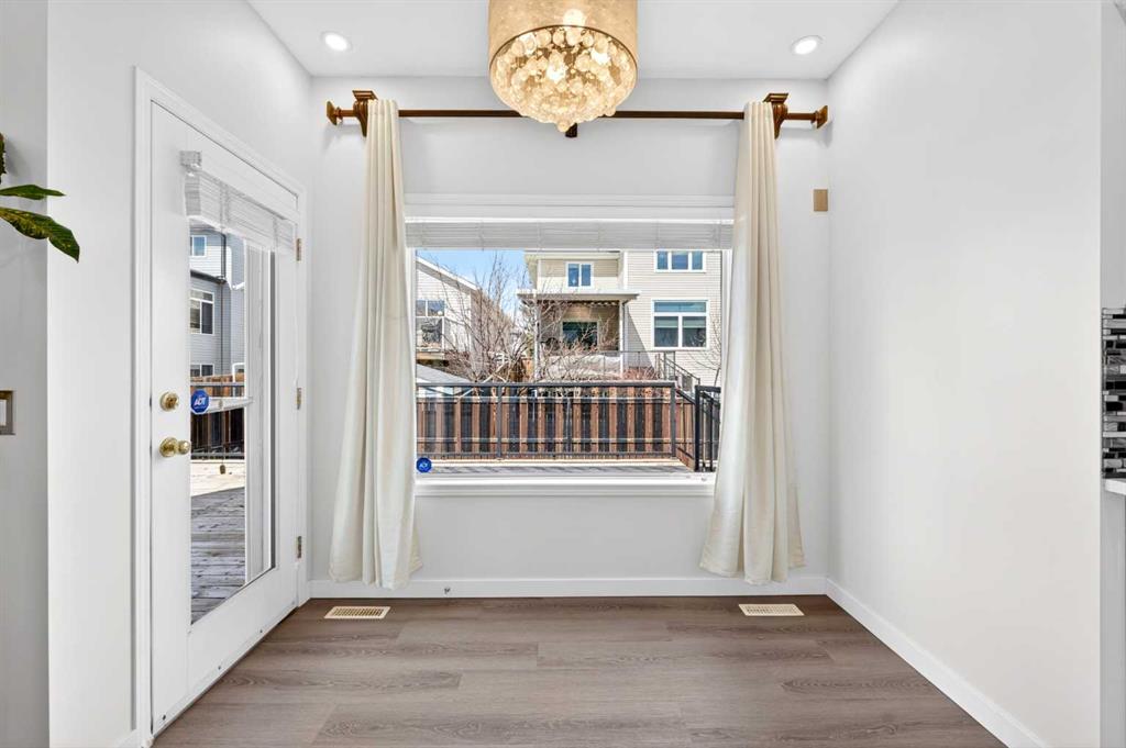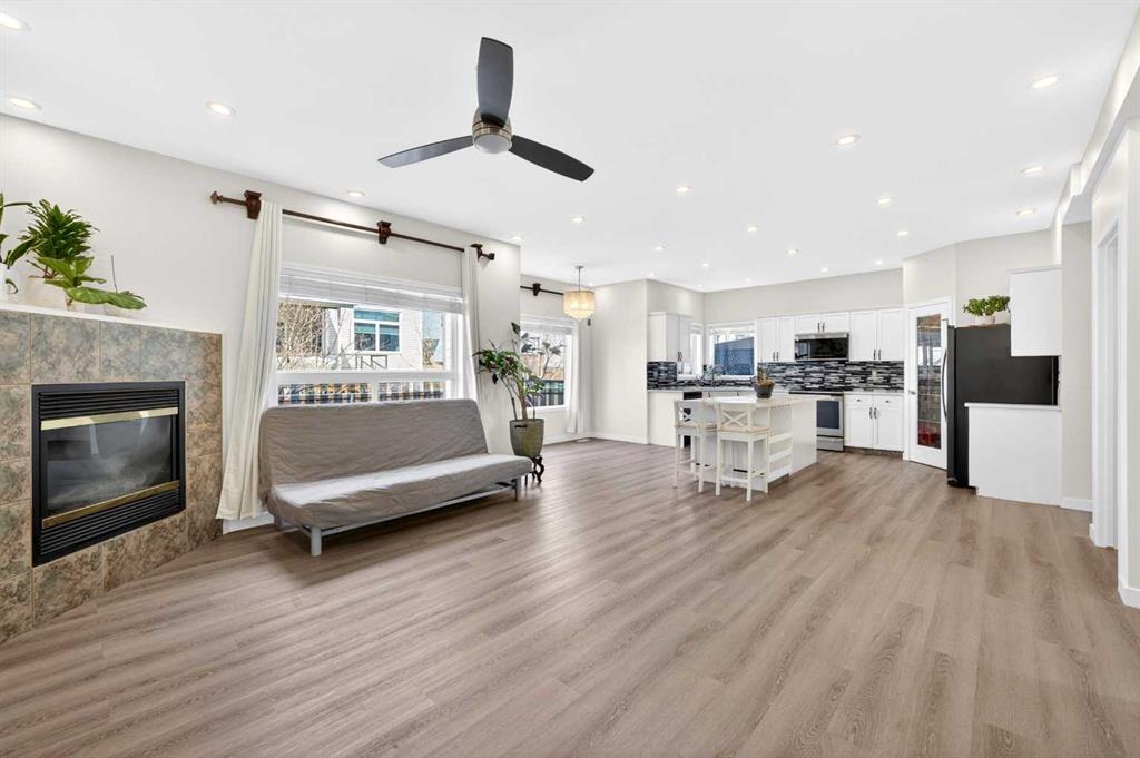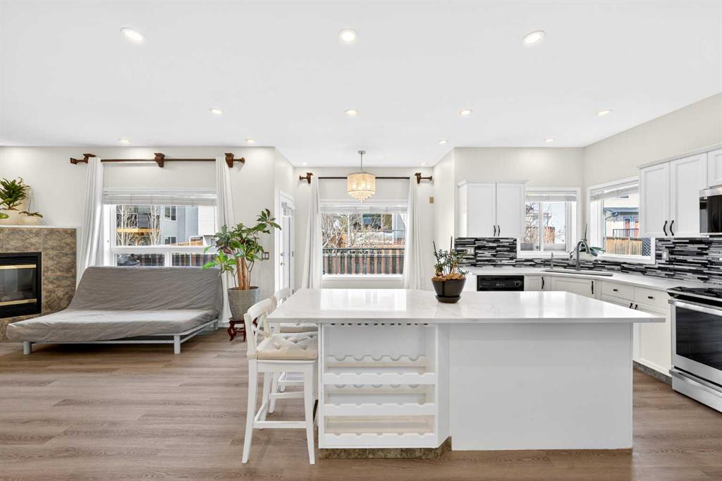 Step onto the welcoming front porch and into a bright 2-storey foyer. One of the standout features of this home is the no-carpet design, with durable vinyl plank flooring (2022) throughout the main and upper levels, creating a clean, modern, and low-maintenance lifestyle. Continue into the sunny South-facing formal Living and Dining room combination, ideal for entertaining. The heart of the home features an open-concept layout with a recently renovated (2022) white Kitchen showcasing a quartz centre island, stainless steel appliances, stylish tile backsplash, and corner pantry. The bright Family room with gas fireplace and adjacent Breakfast nook flow seamlessly together, with access to the large full-width deck—perfect for indoor-outdoor living. A main floor finished with a Den offers a convenient home office or study space.
