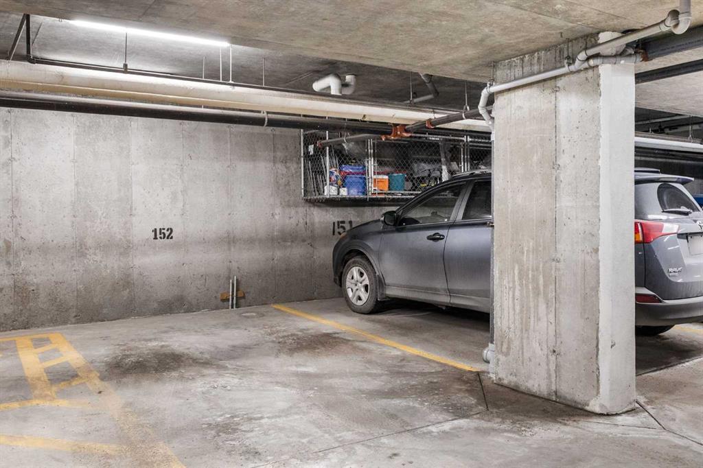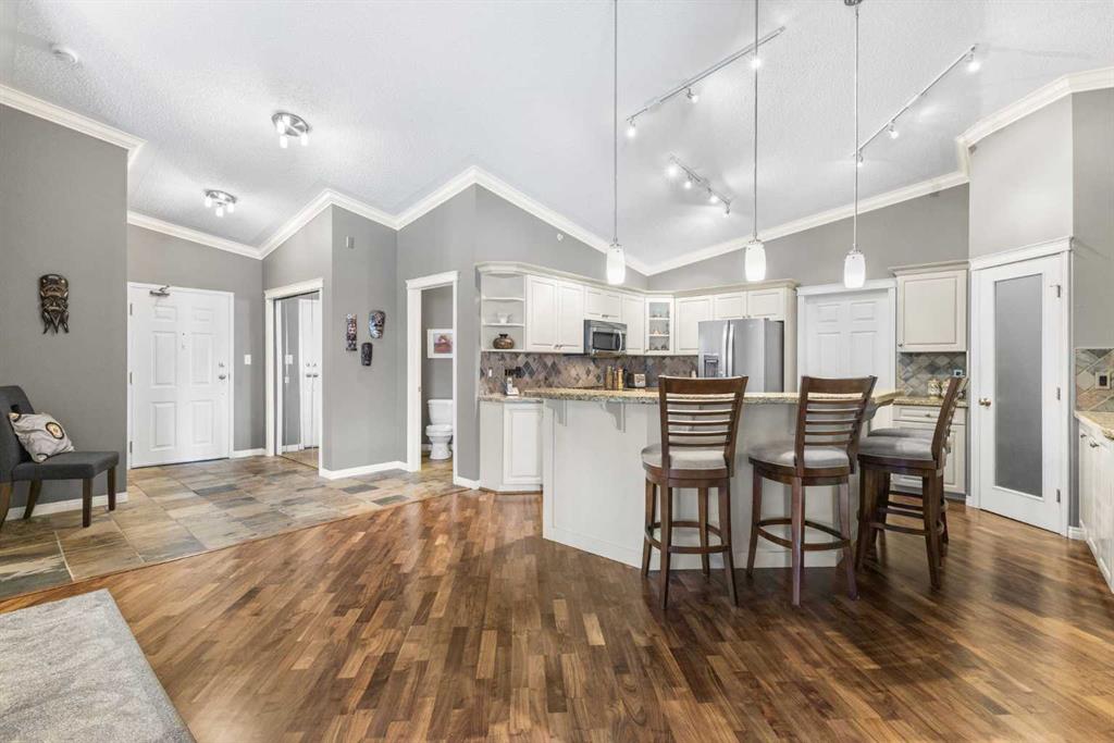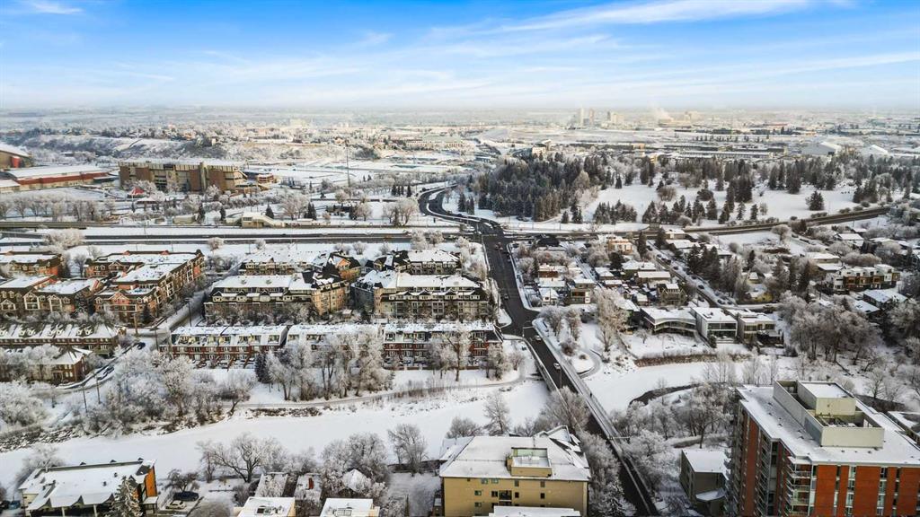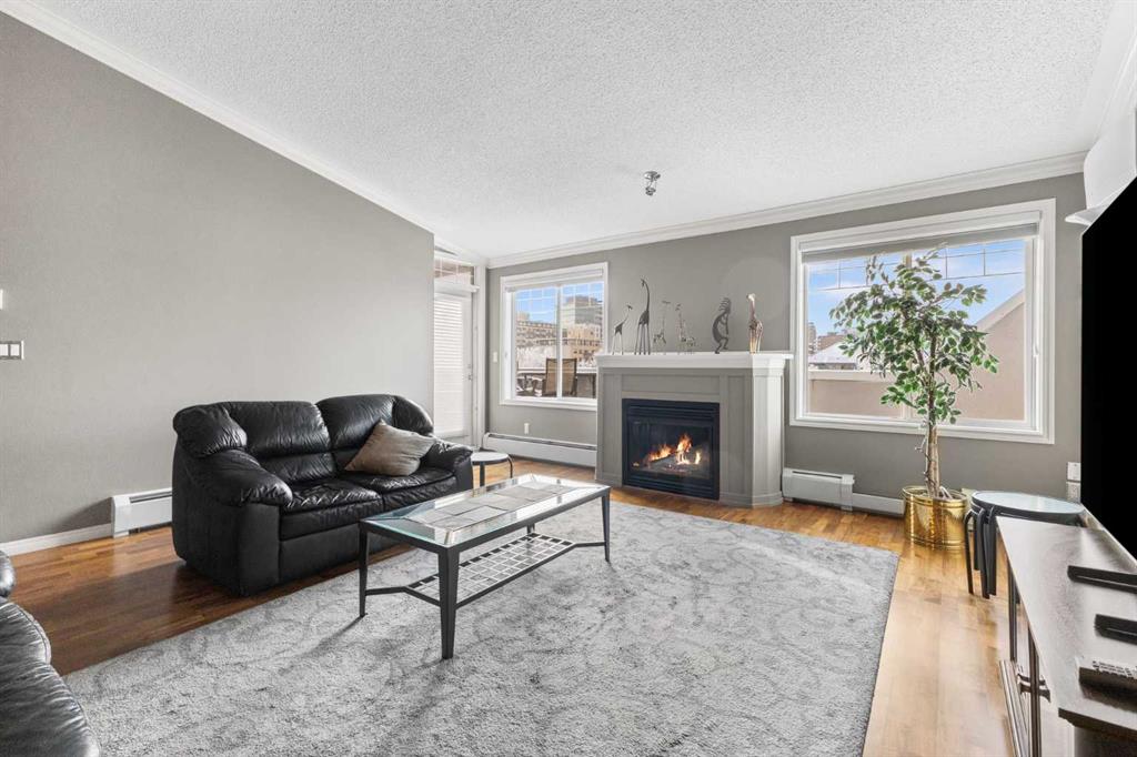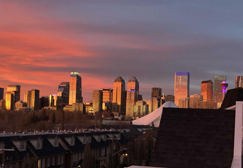 Expansive Top Floor End Unit with City and Downtown Views! This beautifully maintained 2-bedroom, 2.5-bath top floor end unit offers stunning city and downtown vistas, reflecting pride of ownership in every detail. Its open concept design showcases elegant hardwood flooring, vaulted ceilings, and crown moulding, with abundant natural light illuminating the space. The kitchen is tastefully appointed with granite countertops, an island/eating bar, and generous storage solutions including a walk-in pantry. Recent upgrades feature newer appliances, highlighted by a high-end Miele dishwasher. The adjacent dining area provides ample room for entertaining family and friends. The welcoming living room, complete with a feature fireplace, serves as an ideal gathering space for relaxation and socializing. The expansive primary bedroom is enhanced by built-in cabinetry and a custom walk-in closet crafted by California Closets. The private five-piece ensuite features dual sinks, a luxurious soaker tub, and a rejuvenating steam shower. Perfect for use as a home office, the second bedroom includes balcony access, two Murphy beds (one queen, one twin), a walk-in closet by California Closets, and its own private four-piece ensuite. Other notable features include in-suite laundry with additional storage, updated flooring installed in 2016, a Daikin air conditioning unit added in fall 2020, front entrance closet designed by California Closets, spacious deck offering panoramic city and downtown views, and three parking stalls—one titled, two leased—plus a dedicated storage space. This residence is perfectly situated just steps away from the Erlton-Stampede C-train station, the picturesque Elbow River pathways and close to several amenities, including Stampede Park, MNP Community & Sport Centre, the serene Reader Rock Gardens, schools, shopping, and is within walking distance to downtown.