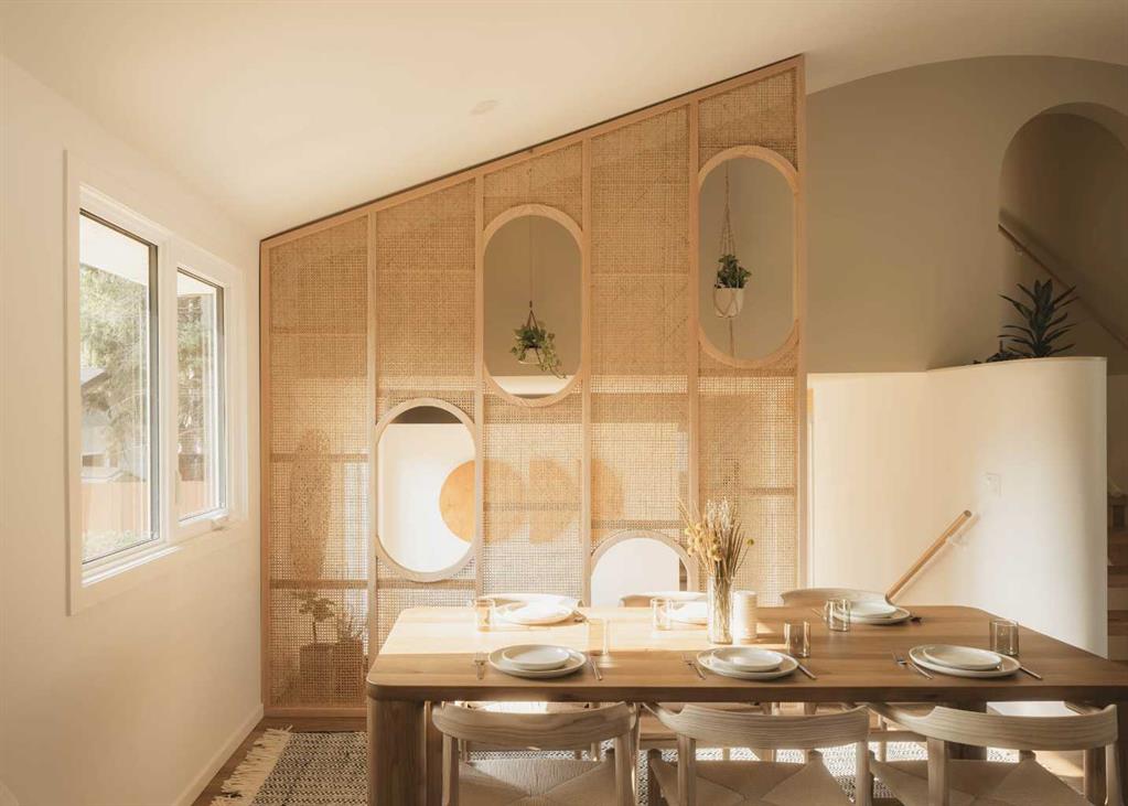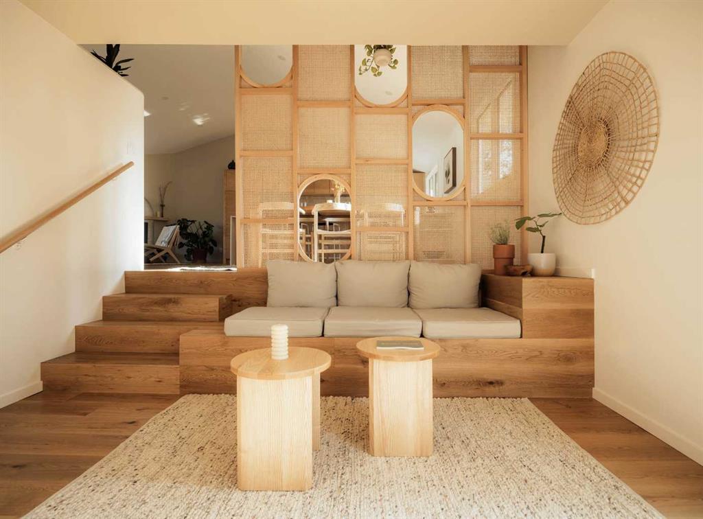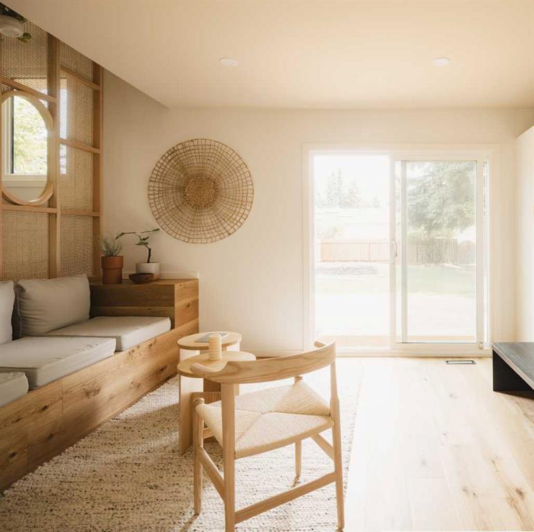 The design was led by Studio North, a Calgary-based firm known for creating spaces that are as functional as they are striking. The living area ceiling was vaulted to double height with curved geometry, flooding the home with light. Custom rattan millwork screens are featured throughout the home, beautiful and functional. Built-in planters bring greenery into the everyday. The original brick fireplace was transformed into a sculptural centrepiece. The kitchen is fully renovated with new cabinets and appliances, the primary bedroom has a new ensuite. Douglas fir, golden oak, and brass throughout. Nothing feels like an afterthought.