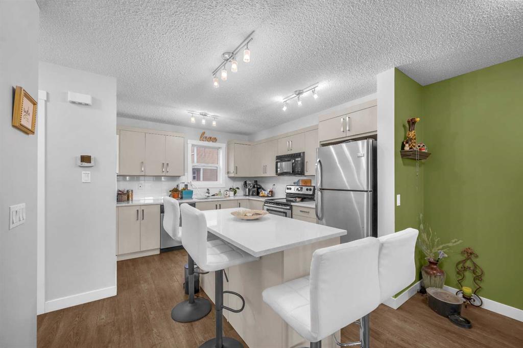 Welcome to your new home in Kings Heights! This beautifully maintained 975 sq ft two-storey townhome offers a bright open-concept layout with stunning luxury vinyl plank flooring throughout the main floor, flowing from the spacious living and dining areas into a larger-than-average kitchen featuring quartz countertops, stainless steel appliances, and plenty of counter and cabinet space—perfect for cooking and entertaining. A convenient two-piece bathroom completes the main level. Upstairs, you’ll find brand-new carpet (October 2025), two generous primary bedrooms each with its own ensuite, ample closet space, and large windows that fill the rooms with natural light, along with upper-floor laundry for added convenience. The tandem double garage below provides room for two cars or extra space for storage, a gym, or a workshop. Recent updates include a new garburator (May 2024) and a brand-new washer (September 2025). Located in the sought-after, family-friendly community of Kings Heights—close to schools, parks, restaurants, and shopping, with a new overpass into Airdre, tons of extra street parking, this home combines comfort, style, and exceptional value. Welcome home!