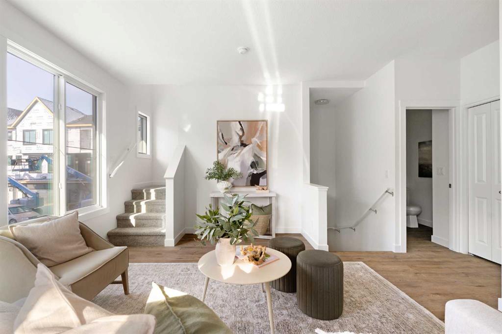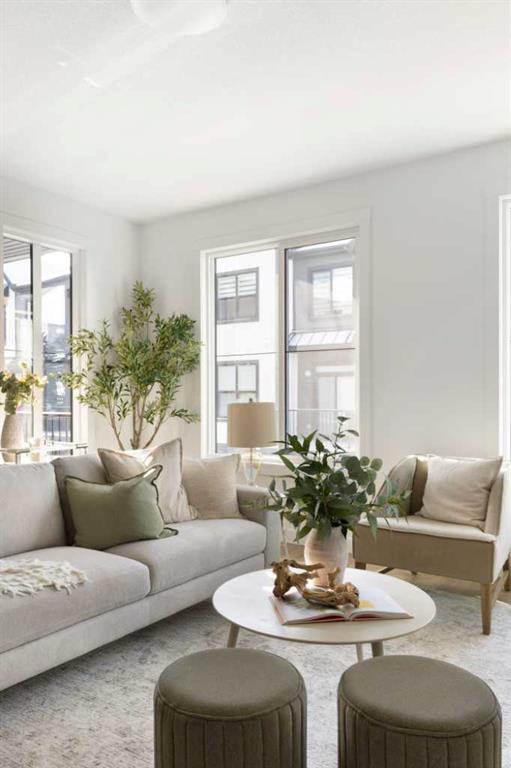 The beautifully finished ‘Armstrong’ by Brookfield Residential is now available in the sought-after community of Rockland Park. This brand-new townhome is thoughtfully designed and extensively upgraded, offering 3 bedrooms, 2.5 bathrooms, and a private double attached garage. The open-concept main floor showcases a timeless white kitchen featuring full-height cabinetry, quartz countertops, and a central island with seating, along with a premium stainless-steel appliance package including a chimney hood fan, built-in microwave and upgraded range. The kitchen flows seamlessly into the dining and living areas, creating an ideal space for both everyday living and entertaining. A wall of west-facing windows fills the main living area with abundant natural light throughout the day. The main level is complete with a west-facing balcony which is perfect for capturing sun through the warmer months and includes a BBQ gas line. On the upper level, the spacious ~11′ x 12′ primary bedroom offers a walk-in closet, private ensuite with walk-in tiled shower, and its own private balcony. Two additional bedrooms, a full bathroom, and a conveniently located laundry area complete the upper level. The lower level features a double attached garage, providing secure parking and ample storage year-round. Additional upgrades throughout create a beautiful and inviting living space that you’ll be proud to live and entertain in. Completing the home is a rough-in for central A/C – making future installation a breeze. If you’re searching for a brand-new townhome in Calgary, this is an exceptional opportunity. The home includes a full builder warranty plus Alberta New Home Warranty, all within the vibrant and growing community of Rockland Park.