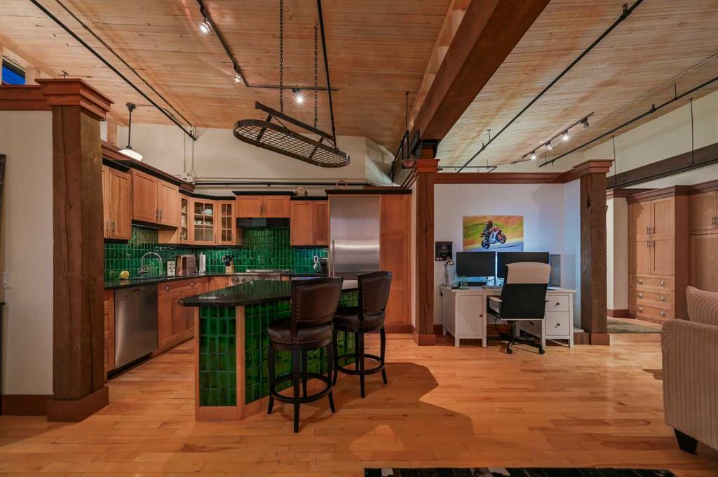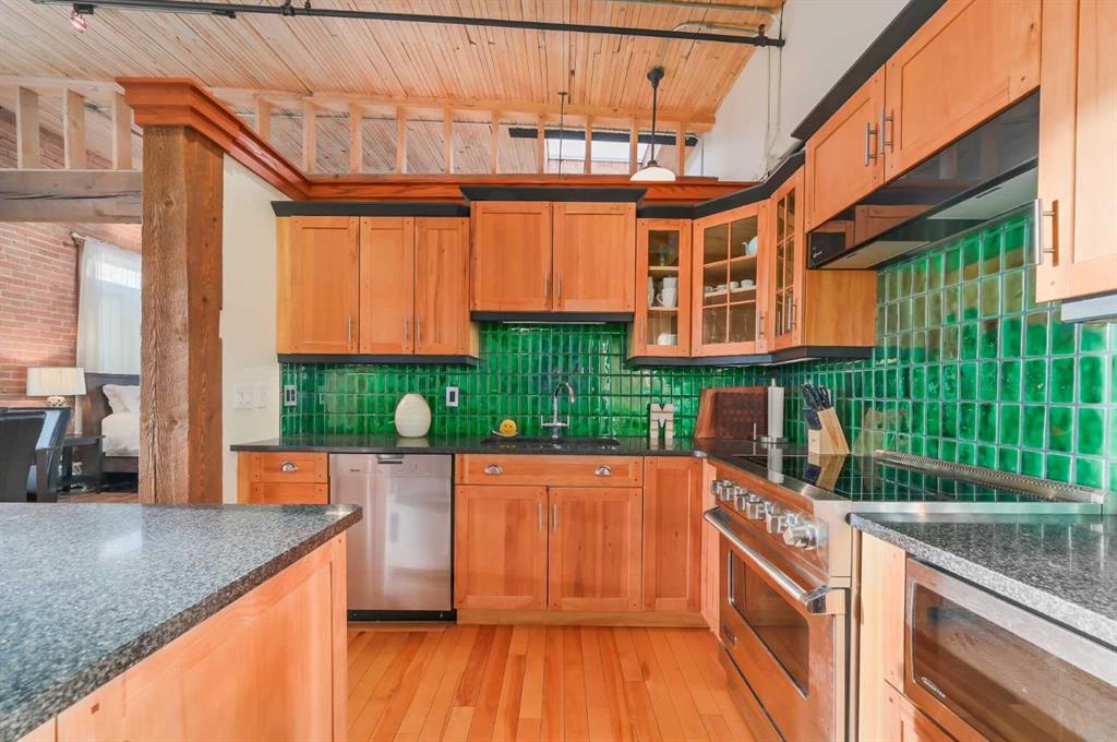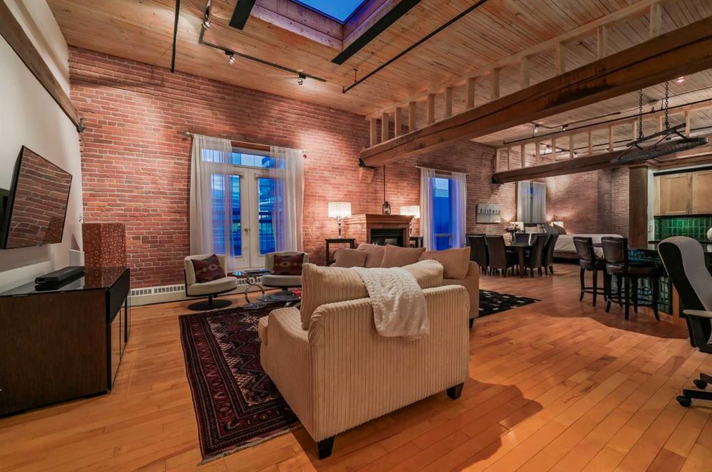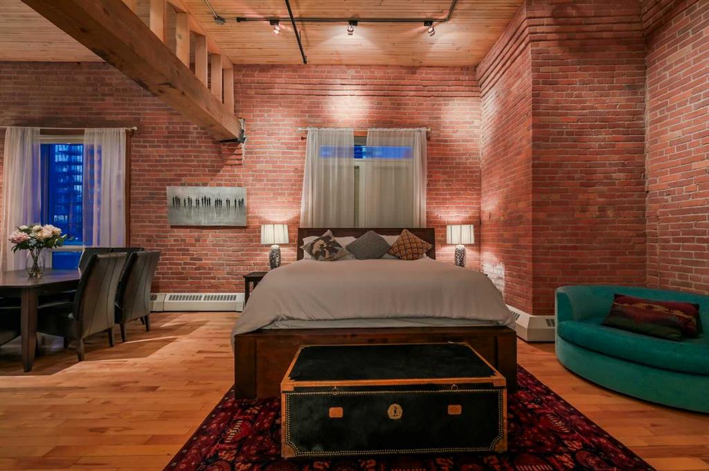 Stunning Penthouse Loft at The Historic Hudson. Nothing will compare…Especially if you’re a couple or single working from home or downtown. Originally built in 1909 by the Hudson’s Bay Company, The Hudson is Calgary’s oldest warehouse converted into mixed-use residential/commercial live-in lofts. This east-facing penthouse loft blends rich history with modern luxury—featuring 13’ ceilings, massive wood beams, exposed brick walls, and two skylights. The chef’s kitchen includes recycled oak cabinetry, granite countertops, and high-end stainless steel appliances: Viking induction range, Sub-Zero freezer, and Miele fridge. The expansive open-concept layout offers large living and dining areas, maple hardwood flooring, and a brick-faced gas fireplace.The primary suite includes a walk-in closet, spa-style ensuite with heated floors, a freestanding cast-iron tub, 10 mm glass rain shower, and private water closet. Two Juliet balconies with French doors add downtown skyline views. A built-in Murphy bed and full wall of oak storage enhance versatility.