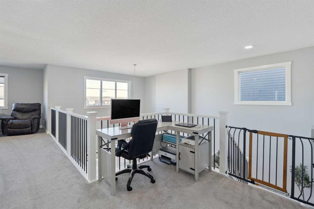 Step inside to an inviting OPEN-CONCEPT main floor featuring a chef-inspired kitchen that is a showstopper with WATERFALL QUARTZ COUNTERTOPS on the ISLAND with a BREAKFAST BAR, an INDUCTION RANGE, sleek hood fan, BUILT-IN MICROWAVE, and a WALK-THROUGH PANTRY connecting seamlessly to the mudroom. The mudroom offers a BUILT-IN BENCH and convenient access to the TRIPLE ATTACHED GARAGE, complete with an EV CHARGER, SIDE ENTRANCE, and a handy BIN STORAGE SYSTEM. The living room impresses with soaring OPEN-TO-BELOW CEILINGS, an OPEN RAILING, and an ELECTRIC FIREPLACE with a MANTLE, creating a stunning focal point for family gatherings. A dedicated OFFICE on the main floor, is perfect for remote work or homework space.