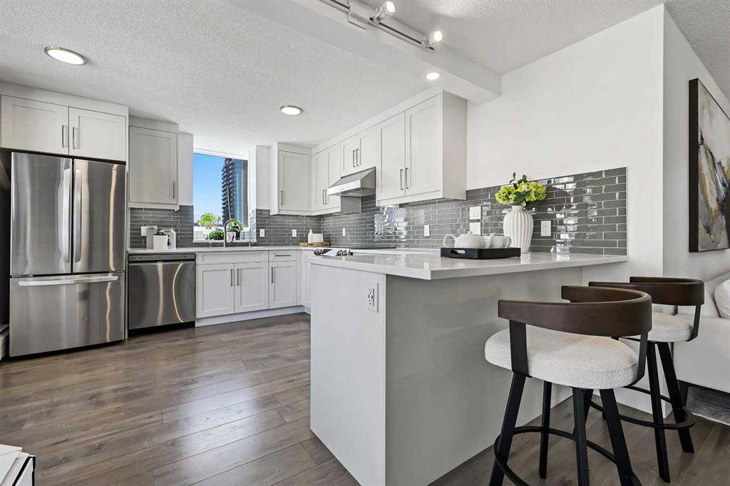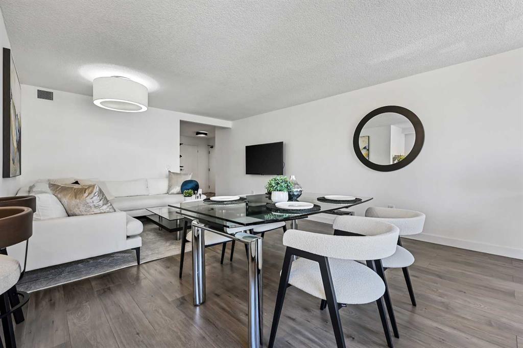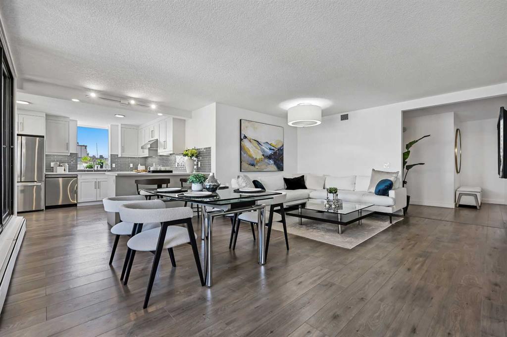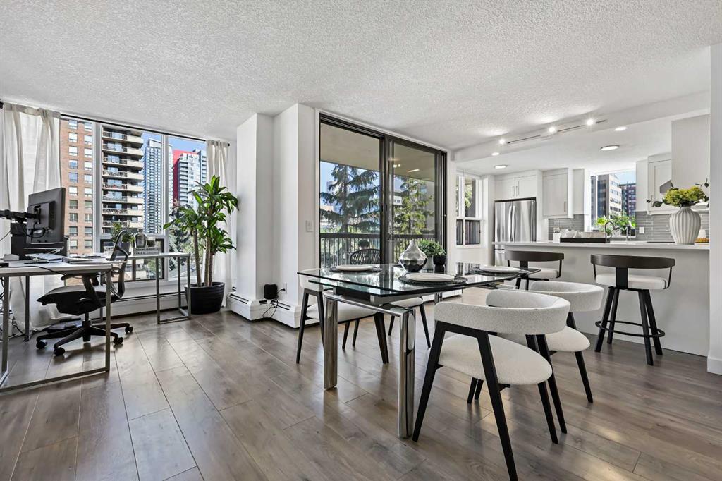 A well-managed, concrete building in Calgary’s Beltline, just a few blocks from vibrant 17th Avenue’s restaurants, shops, and cafés. This north-facing corner home, just shy of 1,300 sq. ft., offers an airy open concept that seamlessly connects the living room, dining room, U-shaped kitchen, a versatile nook (currently used as an office), and a balcony to wind down.