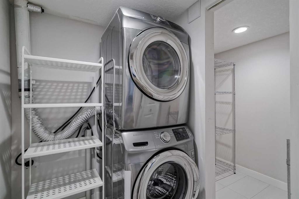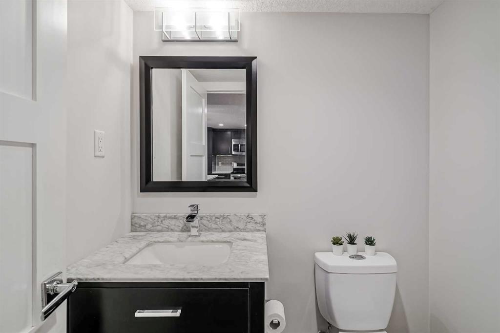 From the moment you enter, you are greeted by the openess of the condo. Laminate flooring which extends throughout the main living areas, creating a modern yet cozy feel. Expansive windows flood the space with natural light and frame breathtaking views of Calgary’s downtown skyline, creating a spectacular backdrop for quiet evenings and entertaining guests alike. The spacious living and dining areas flow effortlessly into a renovated kitchen with high-end stainless steel appliances, perfect for hosting dinners or casual gatherings.