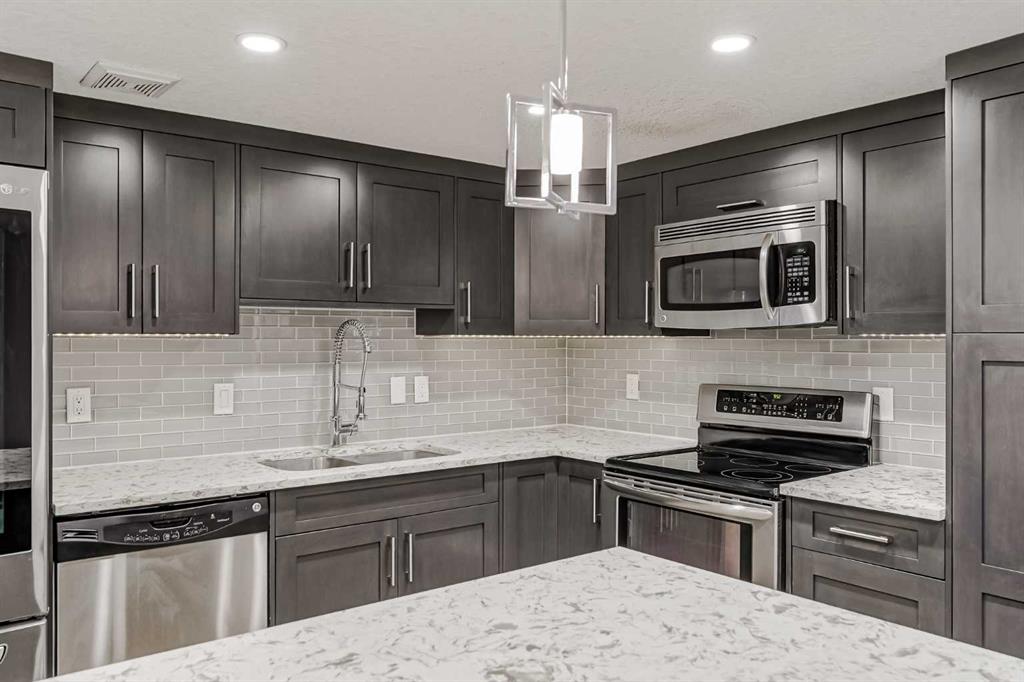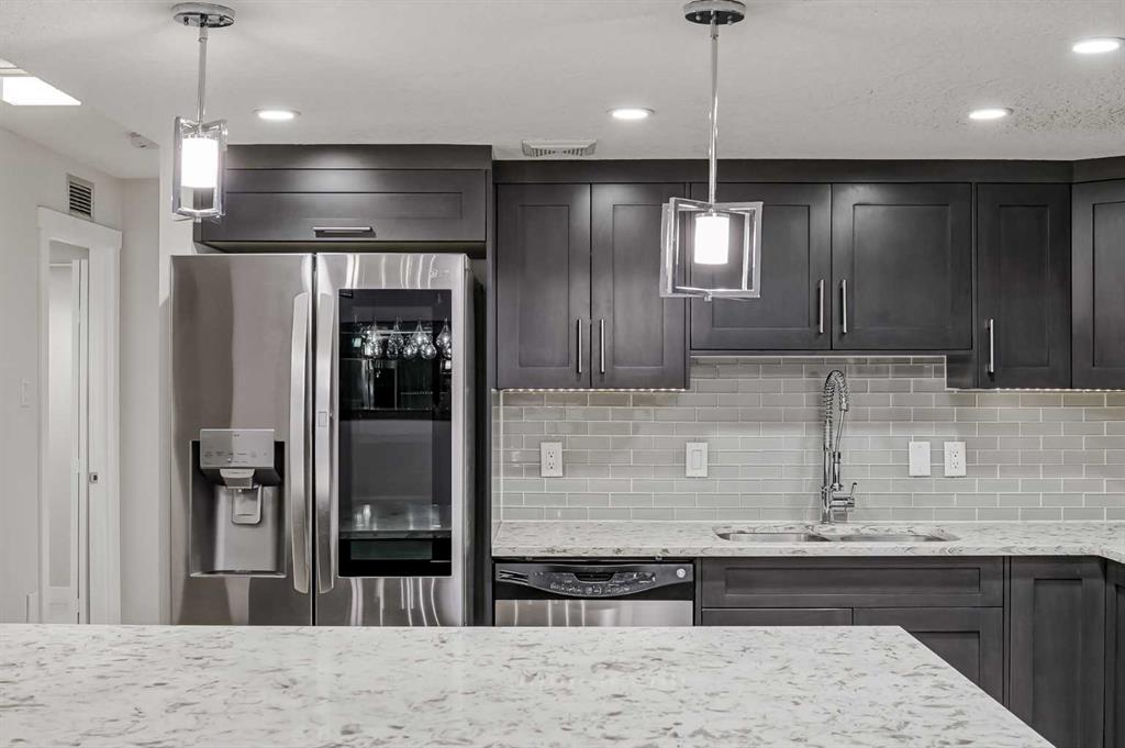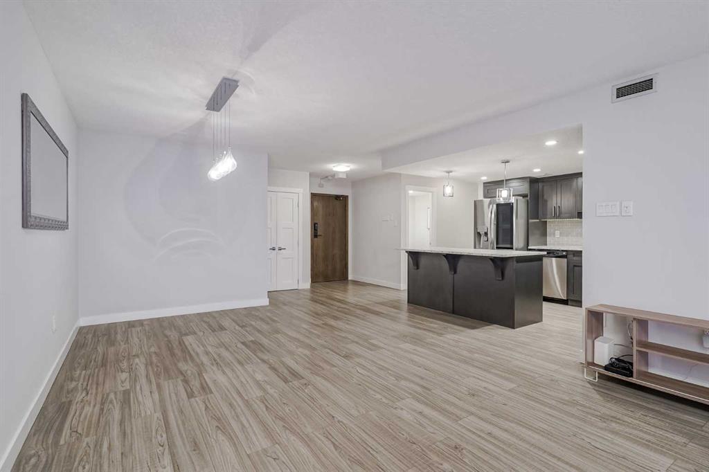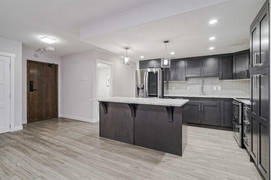 From the moment you enter, you are greeted by the openess of the condo. Laminate flooring which extends throughout the main living areas, creating a modern yet cozy feel. Expansive windows flood the space with natural light and frame breathtaking views of Calgary’s downtown skyline, creating a spectacular backdrop for quiet evenings and entertaining guests alike. The spacious living and dining areas flow effortlessly into a renovated kitchen with high-end stainless steel appliances, perfect for hosting dinners or casual gatherings.
