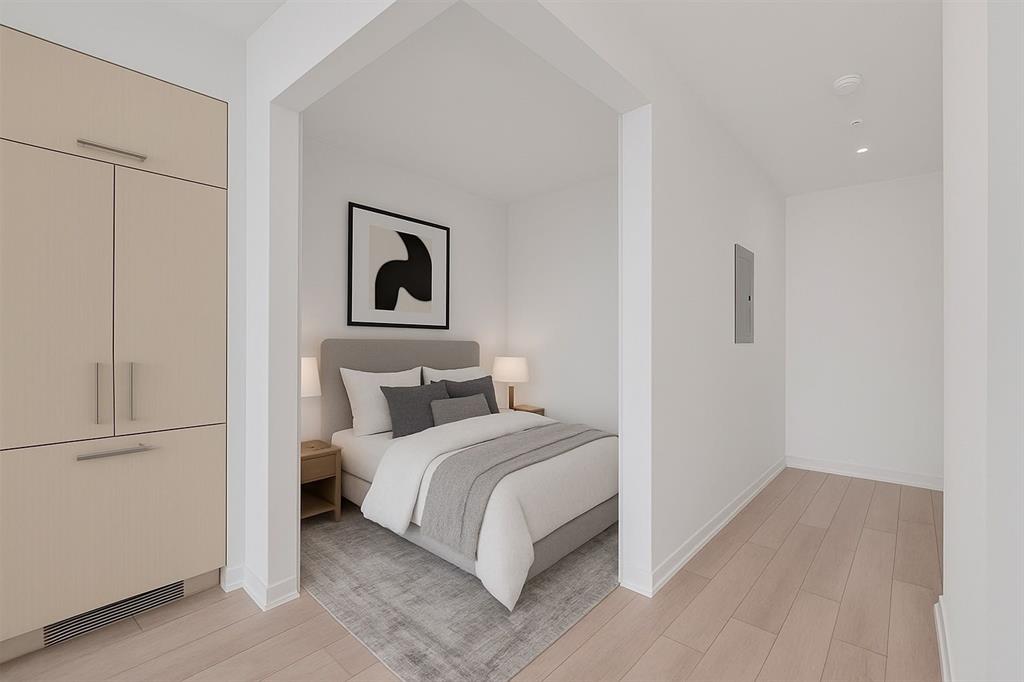 The bright and airy layout is enhanced by contemporary finishes, creating a sleek and modern atmosphere throughout. The kitchen is both stylish and functional, featuring a spacious island, built-in refrigerator and dishwasher, and streamlined cabinetry. Floor-to-ceiling windows bathe the interior in natural light and frame stunning river views, while the East-facing balcony offers a tranquil spot to relax outdoors. Additional interior features include in-suite laundry and air conditioning for year-round comfort. A titled underground parking stall and a separate assigned storage locker are also included for your convenience.