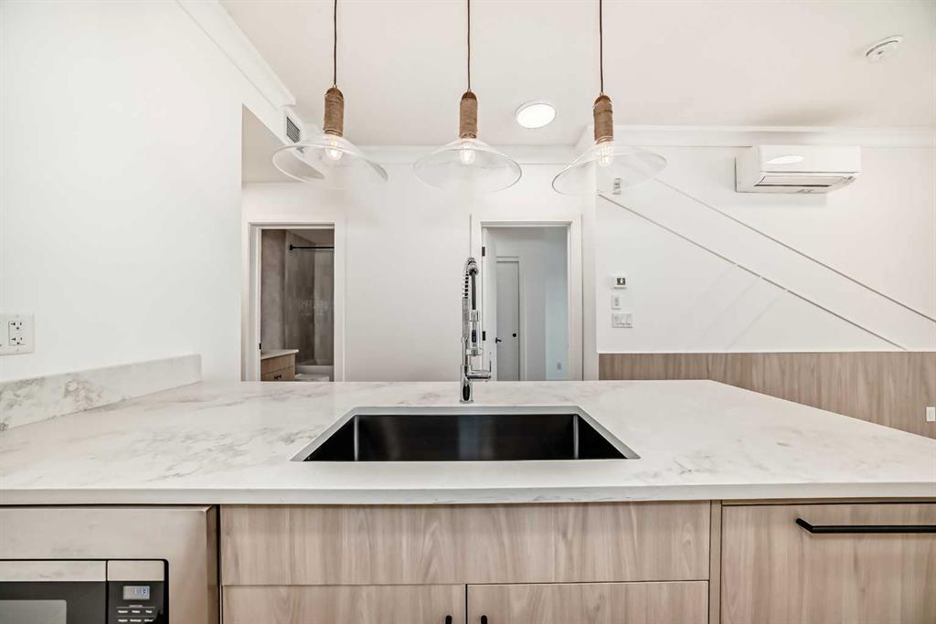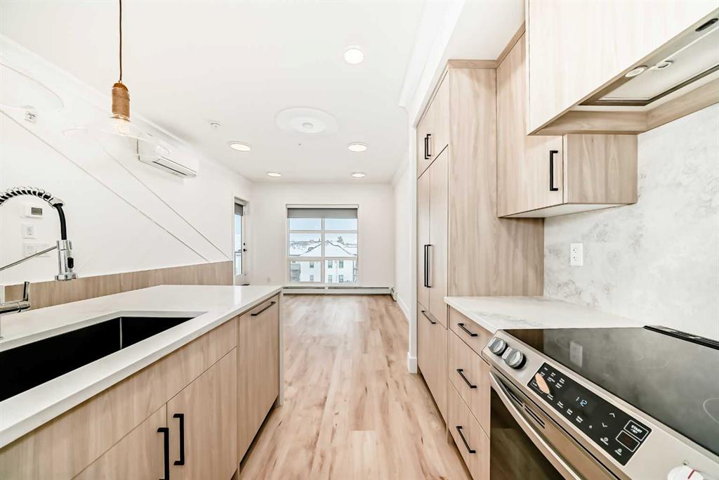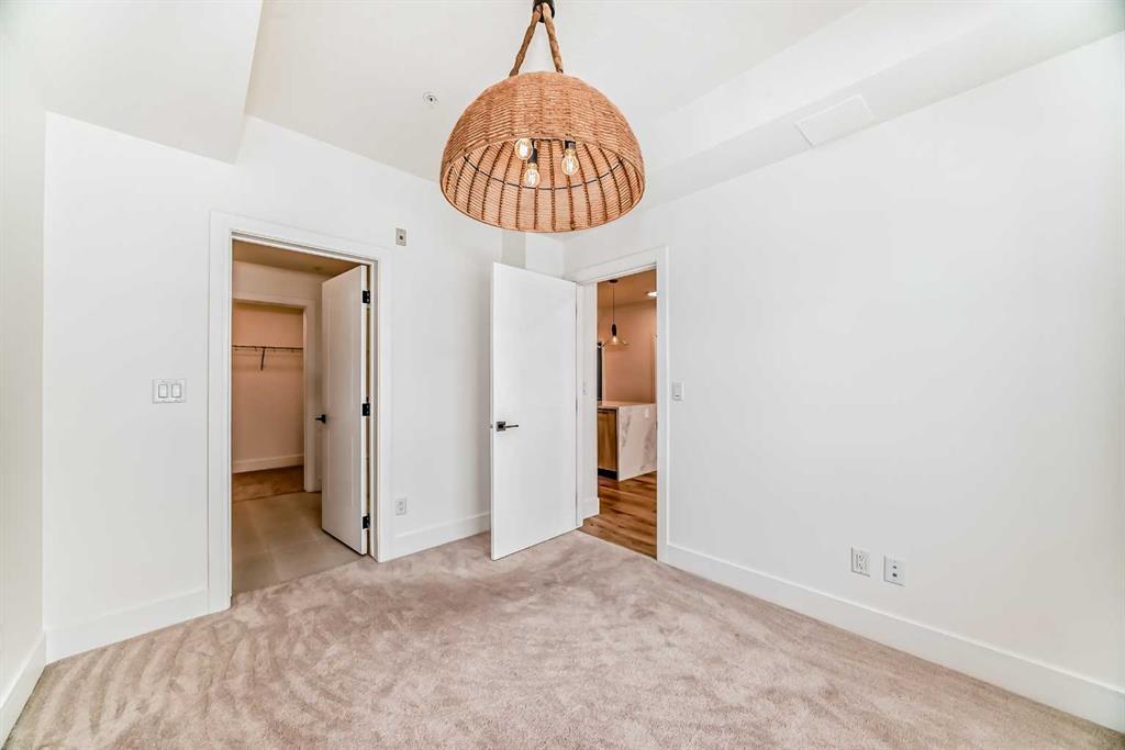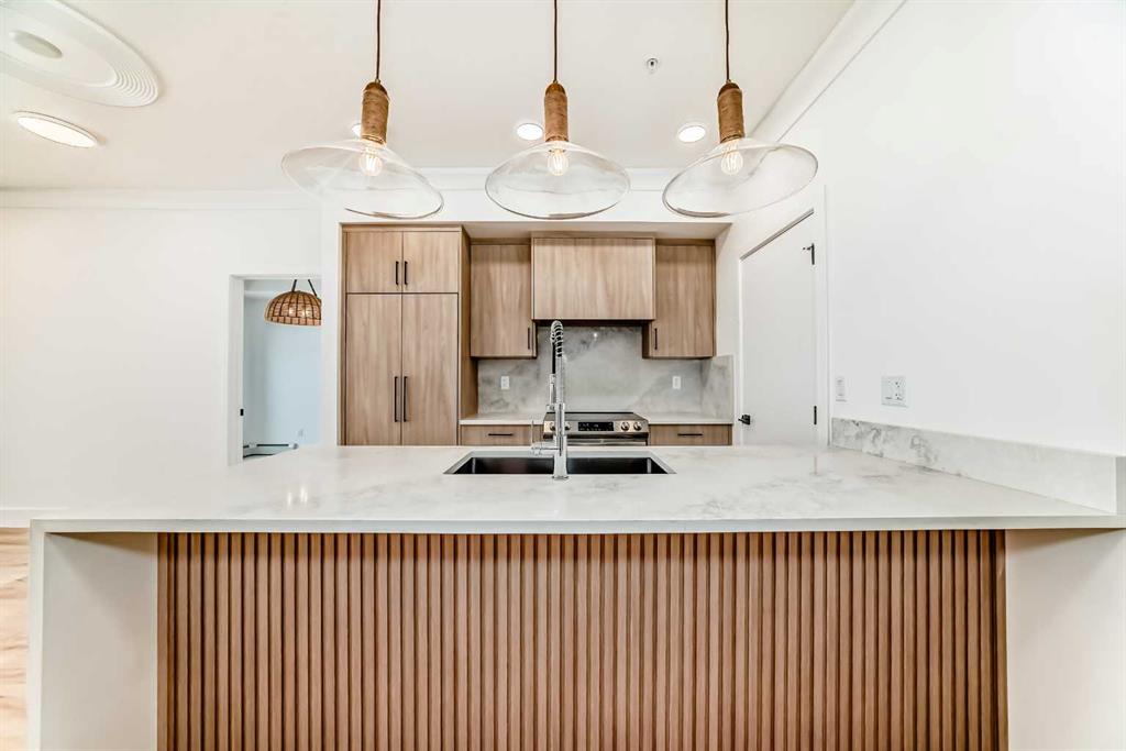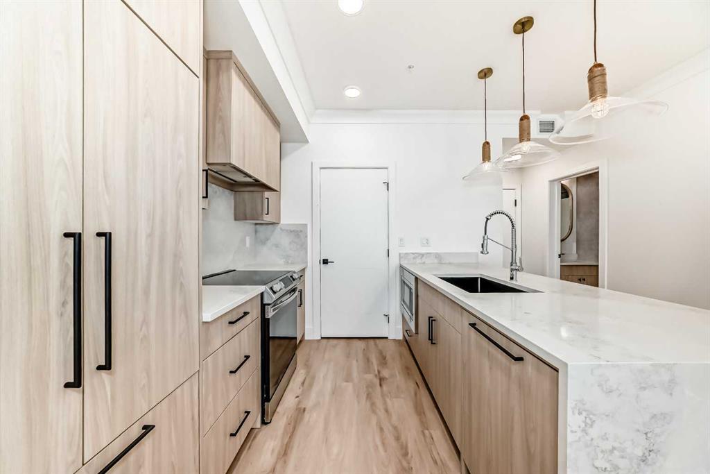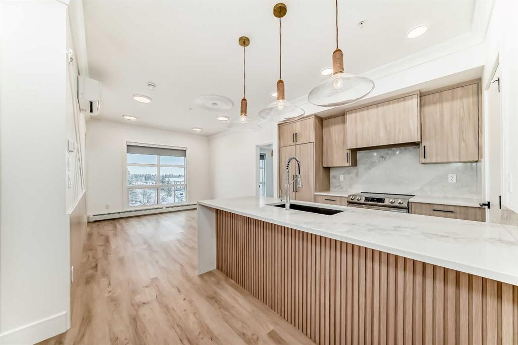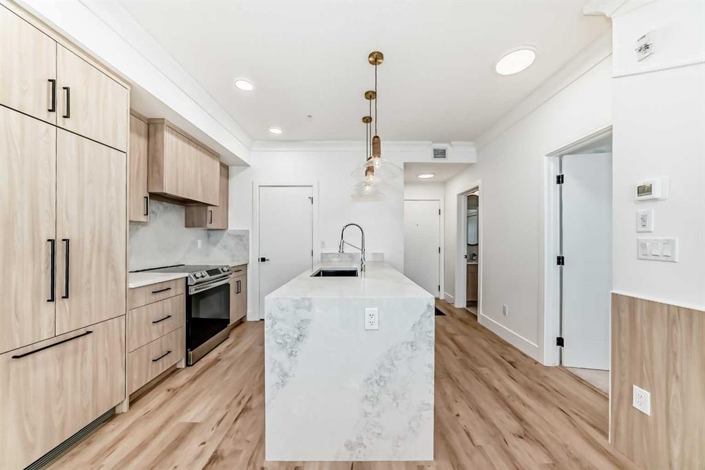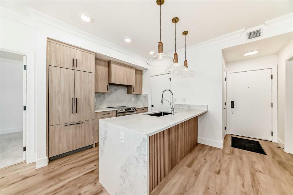 Welcome to the Quesnay in Calgary’s historic Currie Barracks, a community built with a walkable urban design, heritage sites, bike paths, green spaces and dog parks, all minutes from the downtown core. This 2 bed, 2 bath offers an elevated living experience with unobstructed VIEWS of the DOWNTOWN SKYLINE and a front row seat to epic Calgary sunrises. The kitchen showcases a quartz waterfall countertop and panelled Fisher Paykel appliances, custom light fixtures and a designer feature wall. A private covered balcony, CENTRAL AIR CONDITIONING, titled underground parking stall and titled storage locker for comfortable, convenient living. Check the comparables, this one is priced to sell. Immediate possession.