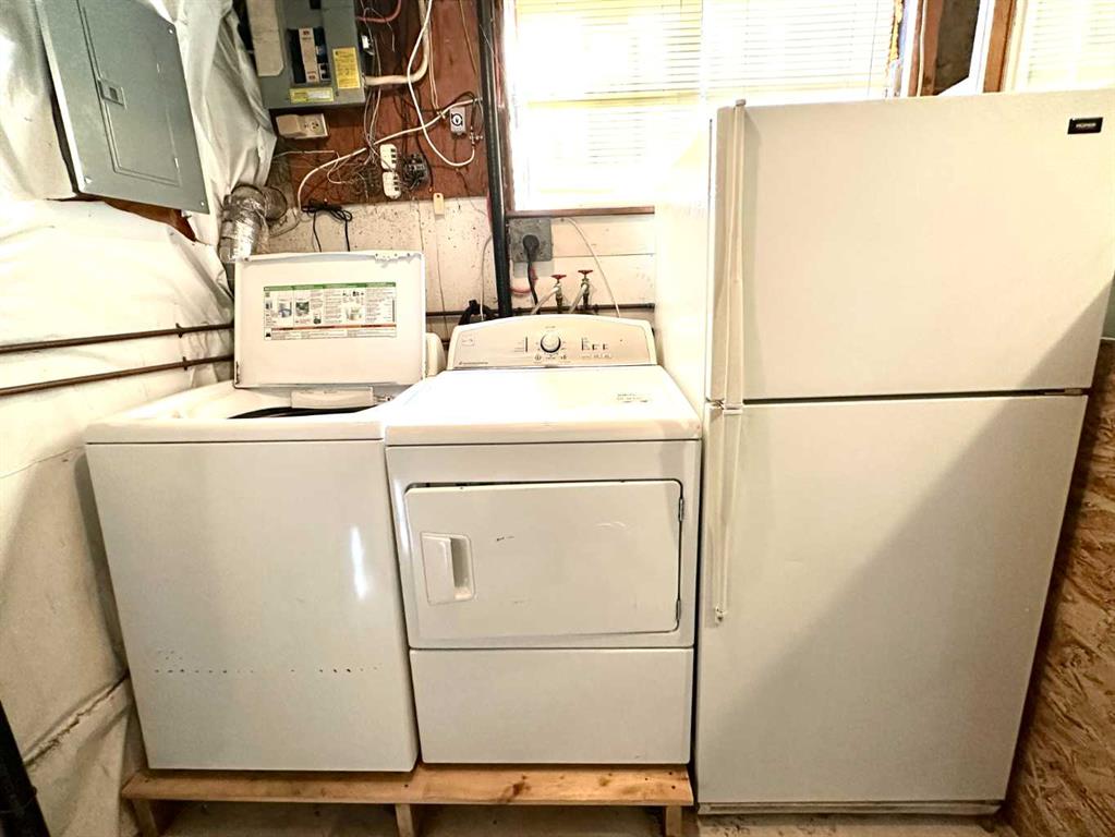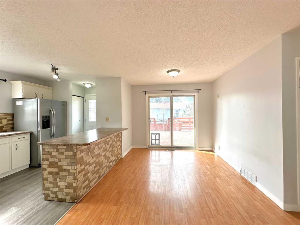 The main floor is bright and inviting, showcasing an open-concept layout with durable vinyl and laminate flooring throughout. The spacious living room is filled with natural light from a large picture window, creating a warm and welcoming atmosphere. The well-appointed kitchen features abundant white cabinetry, ample counter space, and a stainless steel refrigerator, seamlessly connecting to a generous dining area. Patio doors lead to a large deck—perfect for relaxing or entertaining family and friends. This level also includes two well-sized bedrooms and a full 4-piece bathroom.