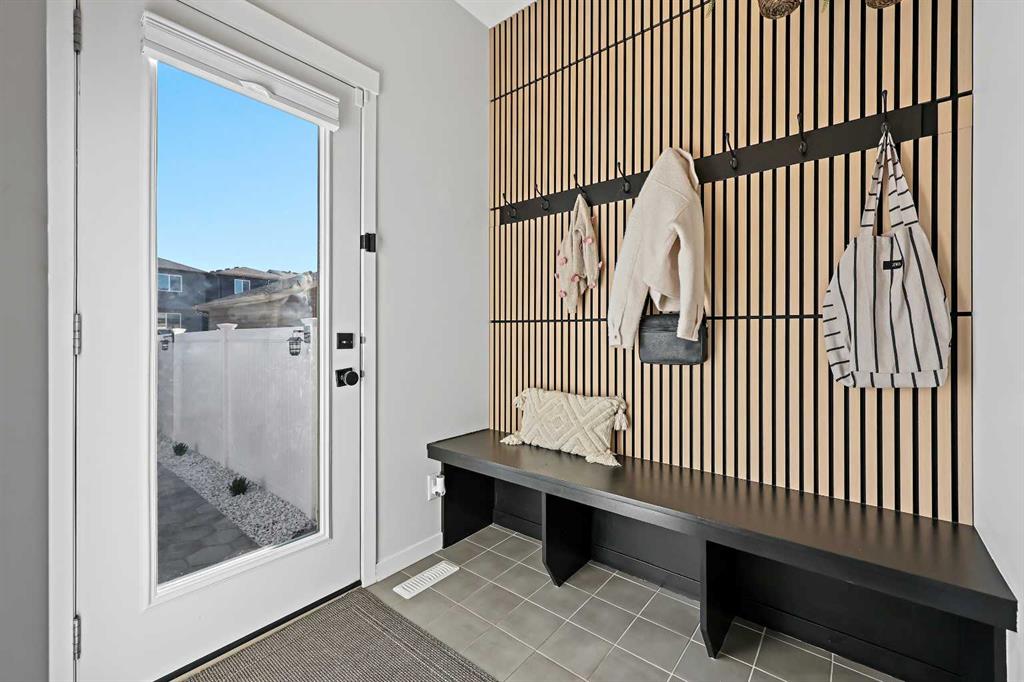 A smartly designed rear mud room with wood wall detailing and a half bath leads to the low-maintenance backyard featuring an 18′ x 12′ concrete paver patio and walkway—perfect for BBQs and entertaining.