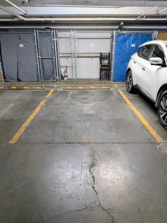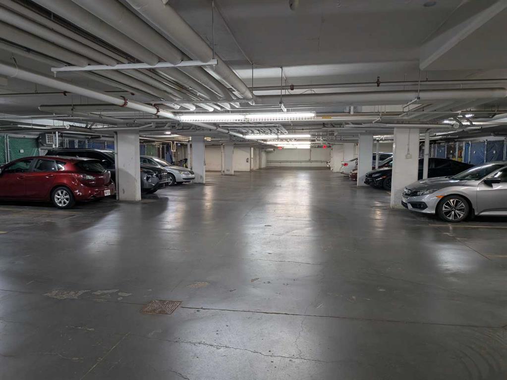 The bedroom includes double closets, while the full bathroom offers a contemporary design with an oversized vanity and sleek finishes. Additional conveniences include in-suite laundry, titled underground parking, and an assigned storage locker.