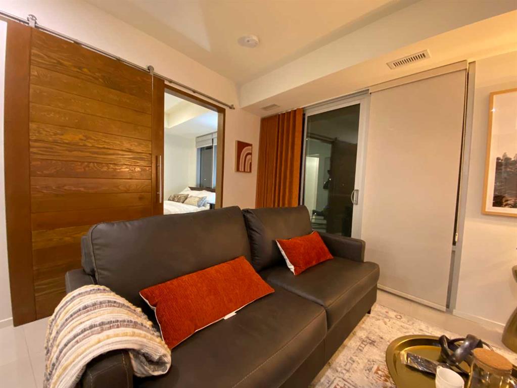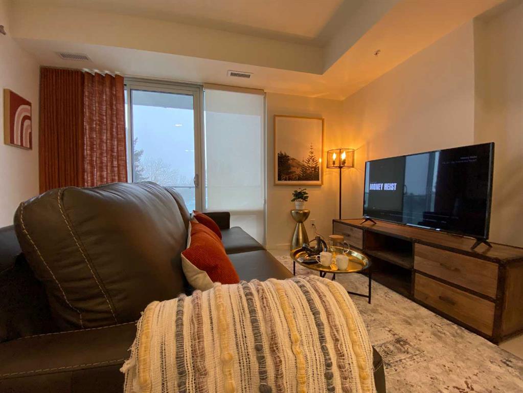 The Avli on Atlantic — Located in the heart of the iconic Inglewood community at the confluence of the Bow and Elbow Rivers, this exquisite 2-bedroom, 2-bathroom condo offers refined inner-city living. The home features sleek tiled flooring throughout and a stylish European-inspired kitchen complete with an integrated refrigerator and dishwasher, luminous white quartz countertops with a central island, and stainless steel appliances, including a five-burner gas stove and microwave range hood.