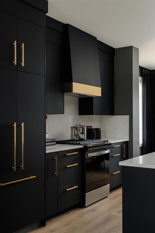 The main living level is bright and inviting, with soaring ceilings, wide-plank flooring, and an open-concept layout designed for modern living. The chef-inspired kitchen is a showpiece, featuring full-height cabinetry with soft-close doors, a gas range, integrated refrigerator, built-in microwave, and a spacious pantry. A large eat-up quartz island anchors the space—perfect for casual dining, hosting friends, or enjoying a quiet morning coffee.