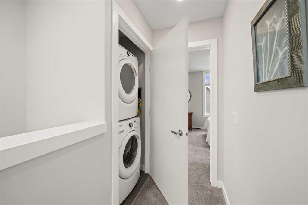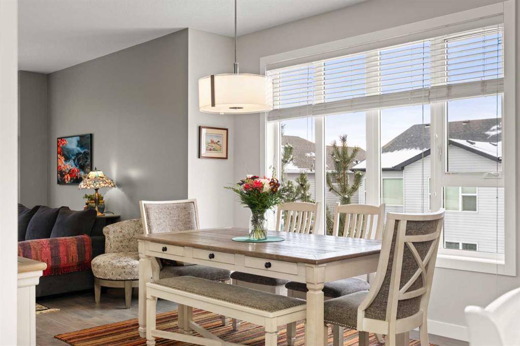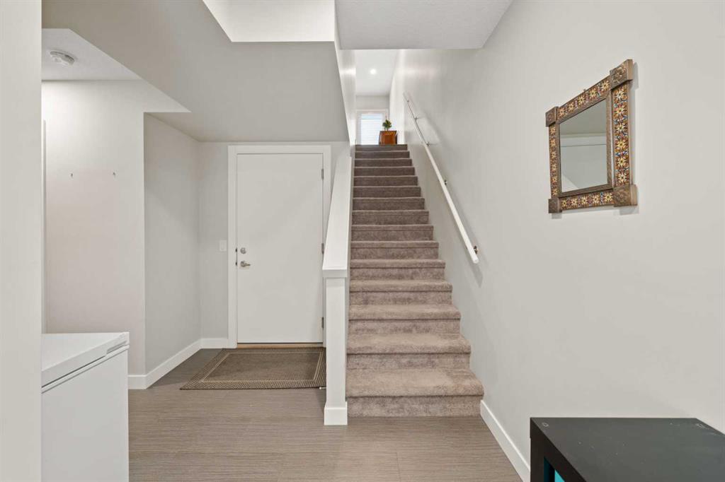 The main living level offers an open-concept layout enhanced by luxury vinyl plank flooring. The contemporary kitchen is both stylish and functional, featuring quartz countertops, cabinets extended to the ceiling, generous counter space, a pantry, and stainless steel appliances. Step onto the west-facing balcony to enjoy breathtaking mountain views and unforgettable sunsets. This level is completed by a spacious dining area and a bright, inviting living room filled with natural light from the abundance of windows—perfect for entertaining or relaxing!