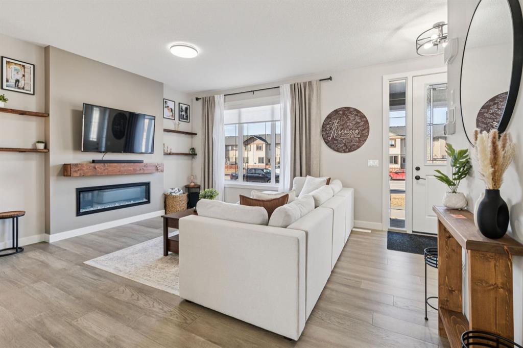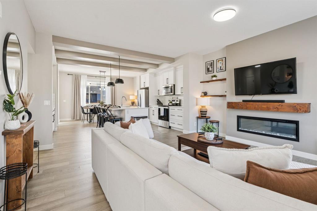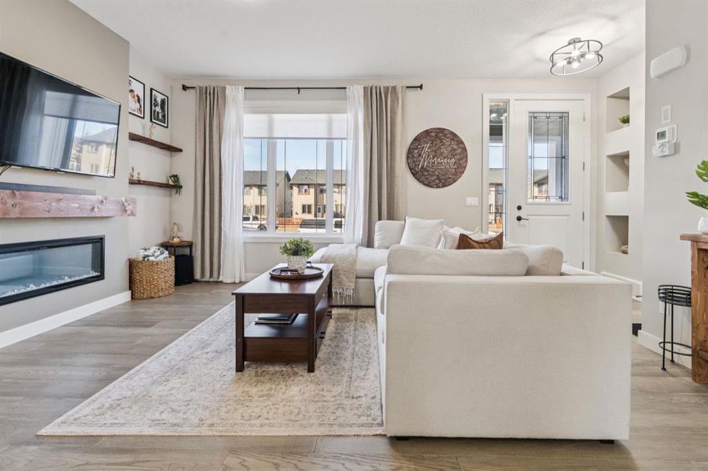 Step inside to a bright and inviting main floor featuring luxury vinyl plank flooring, striking black lighting accents, and a stunning white kitchen designed to impress. The kitchen showcases ceiling-height cabinetry, quartz countertops throughout, a dedicated coffee bar, and quality appliances including a French-door refrigerator, stove, and microwave, perfect for both daily living and entertaining. The open living space is anchored by a cozy electric fireplace with mantel, creating a warm focal point.