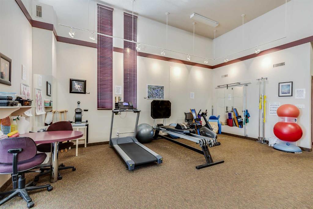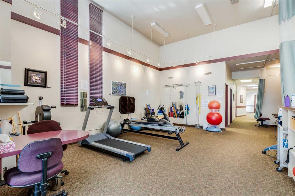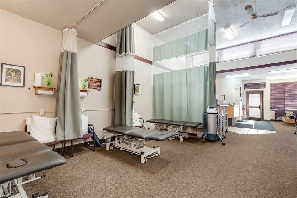 Inside, the space is bright, welcoming, and impressively well-kept. The layout includes five private treatment rooms, a large open exercise area with two additional treatment spaces, a professional reception and waiting area, an office, file storage, two washrooms (one with a shower), and a laundry room. Comfort is ensured with two newer forced-air furnaces and central air conditioning.