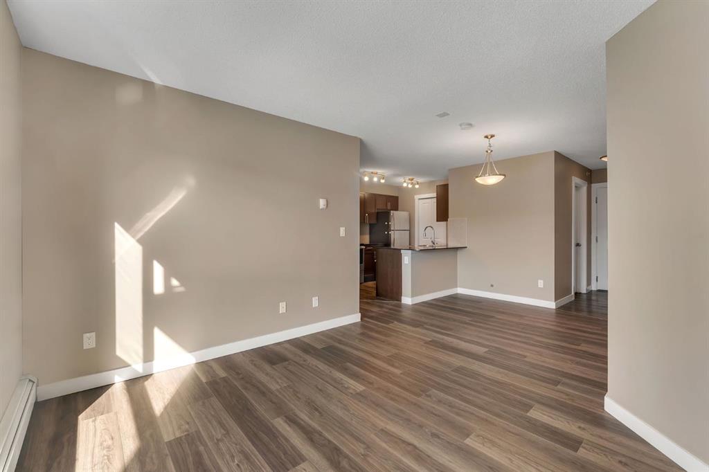 The condo showcases durable and stylish luxury vinyl plank (LVP) flooring throughout, complementing the clean, modern design. The open-concept living and dining area flows seamlessly, offering a comfortable space to relax or host guests.