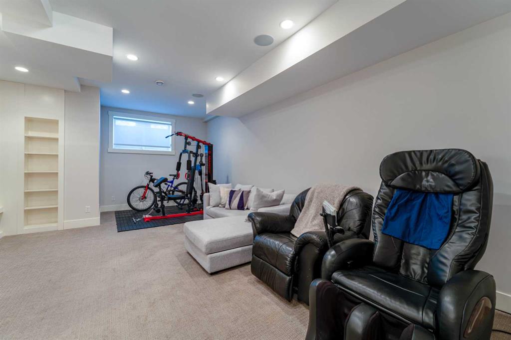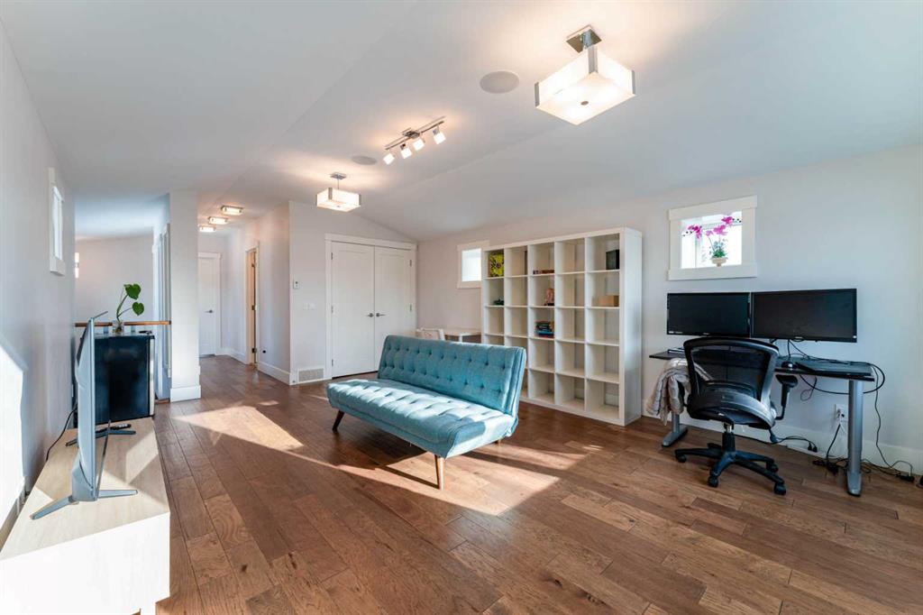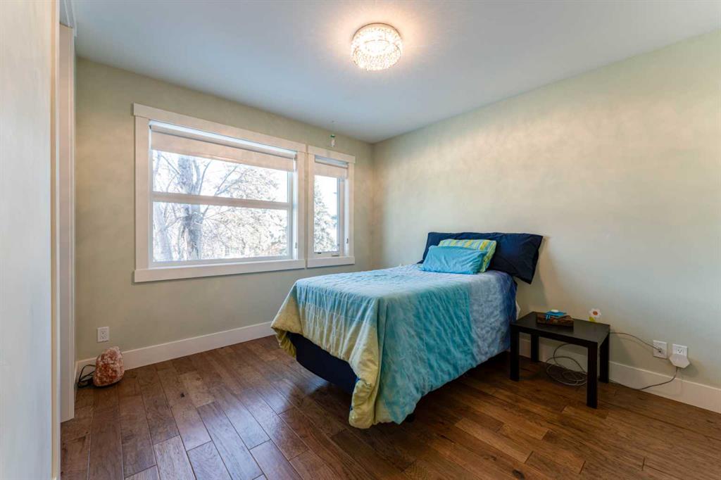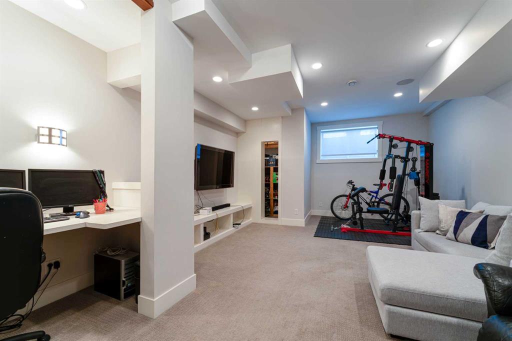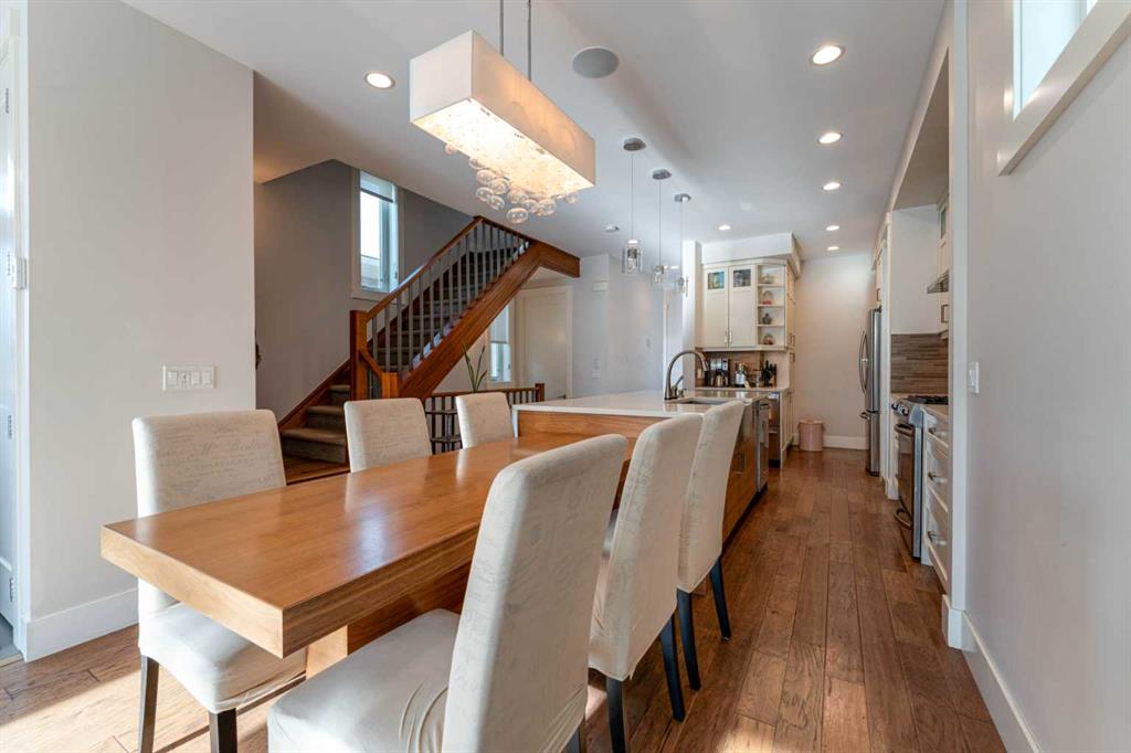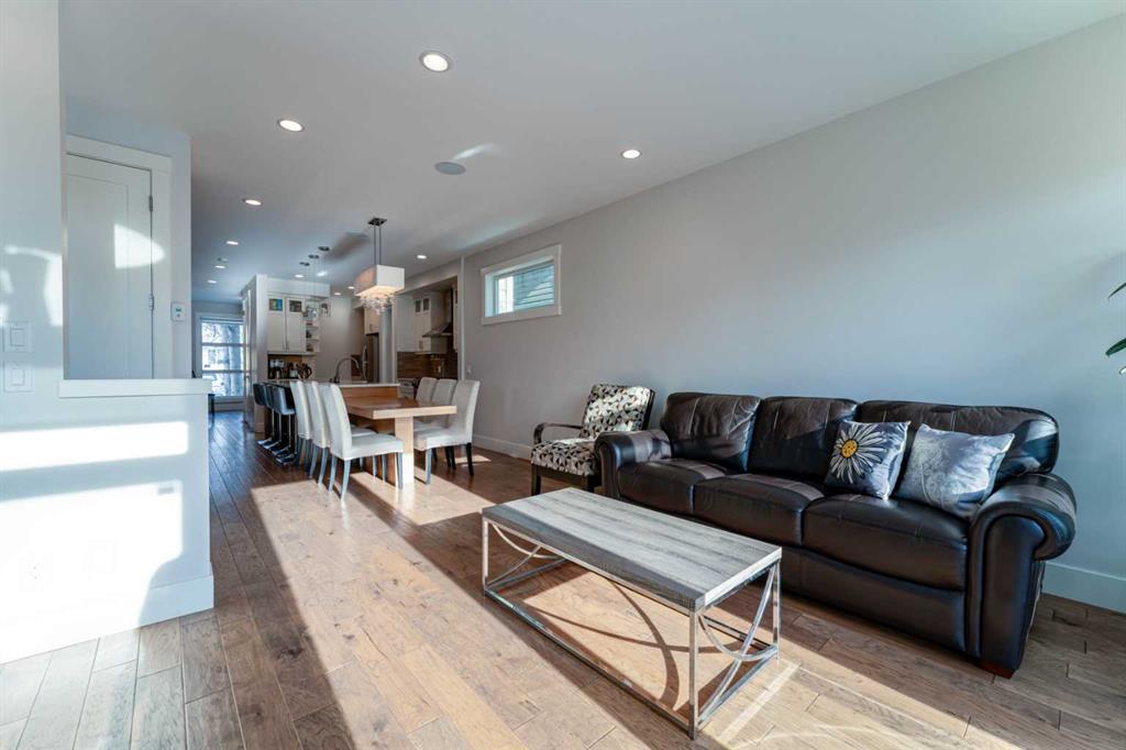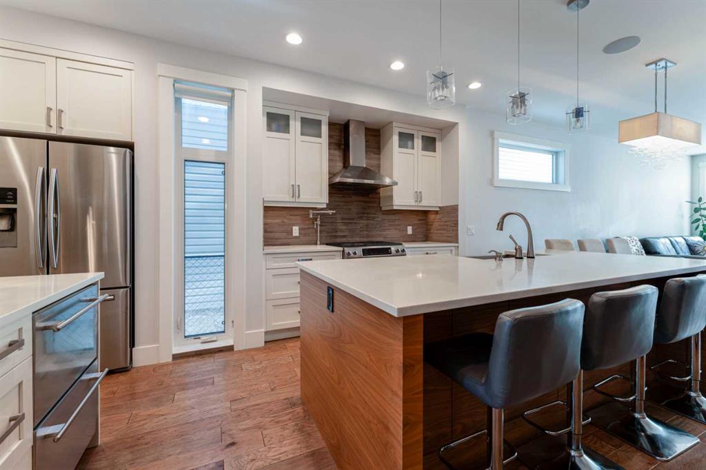 Thoughtfully crafted with eco conscious features throughout, the home includes in floor heating on all levels, spray foam insulation, and triple pane heat deflecting windows. Each floor has dual zone temperature controls. Spanning approximately 3,200 square feet of fully finished living space, the open concept layout is flooded with natural light thanks to numerous windows and a sunny south facing backyard. The main floor welcomes you with a stylish front entrance featuring a built in bench beside a flexible office or study space. Wide plank hardwood flooring carries through the main and upper levels, leading into a beautifully designed living area with a sleek gas fireplace and custom built ins. The chef inspired kitchen is the heart of the home, complete with stainless steel appliances, quartz countertops, a gas range, extensive cabinetry, and a massive island with seating that is perfect for entertaining. Upstairs, the primary retreat is a true sanctuary, offering a luxurious five piece ensuite with double sinks, a large soaker tub, and an oversized glass steam shower. A spacious second bedroom, a full bathroom, and a conveniently located laundry room complete the second level. The third storey features a generous bonus or family room, a third bedroom, and another full bathroom, making it an ideal space for guests, teens, or a private retreat. The builder finished basement adds even more versatility with a cozy media or TV area, built in shelving and workspace, a fourth bedroom, and a full bathroom. To finish off the basement, you have a built-in hidden wine cellar. Meticulously maintained with a recently replaced new furnace and circulator heads for the in-floor heating that should last another 10-15 years. Step outside to a backyard with a well designed garden bed surround an oversized deck accessed directly from the living room sliding doors. The fully fenced yard offers both beauty and privacy, while the double detached garage features dual sided doors, with an additional door to drive through and park a well sized RV, trailer or more. With four bedrooms, five bathrooms, exceptional craftsmanship, and high end finishes throughout, this home is a rare opportunity for those seeking modern luxury, comfort, and sustainability in one of Calgary’s most desirable inner city communities. Book your private showing today.