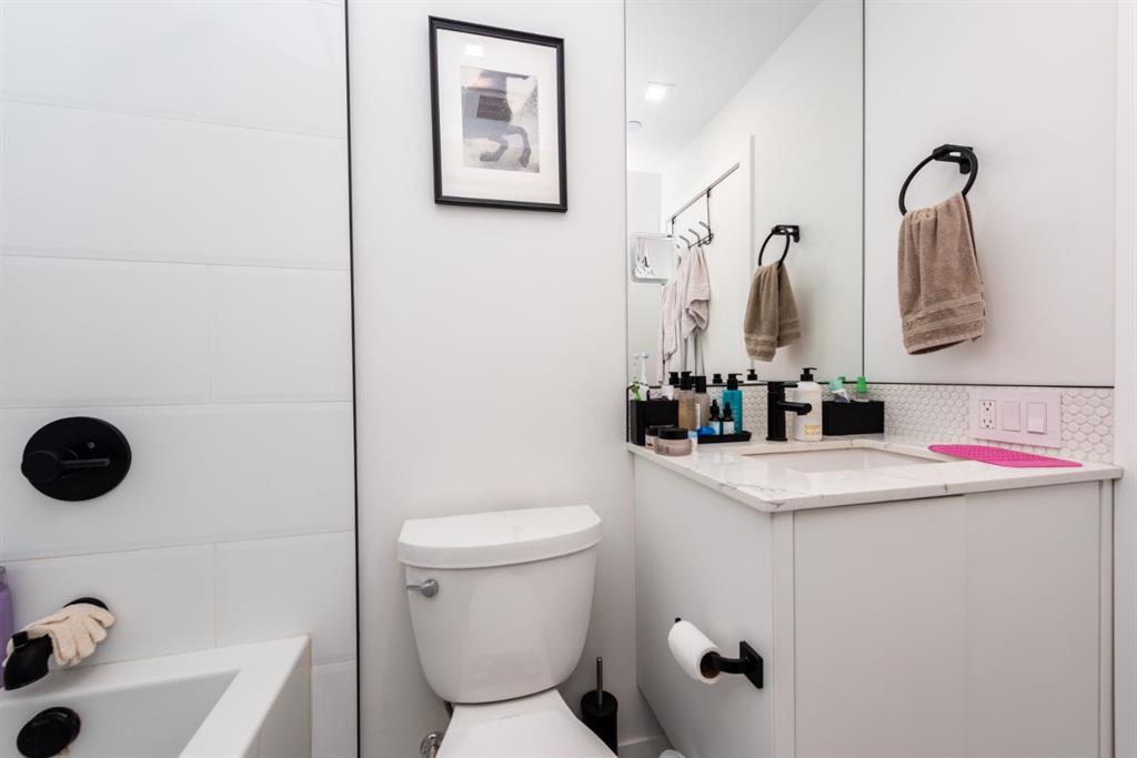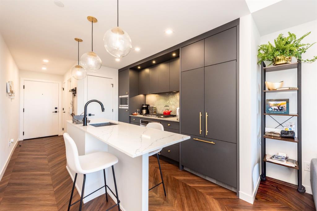 Floor-to-ceiling glass in the living room, 9’ ceilings, and LED pot lighting create a bright, modern atmosphere. The chef-inspired kitchen features quartz countertops, a gas cooktop, wall oven, and custom soft-close cabinetry. Retreat to the bedroom with its expansive walk-in closet, and step out onto your private balcony with sweeping views.