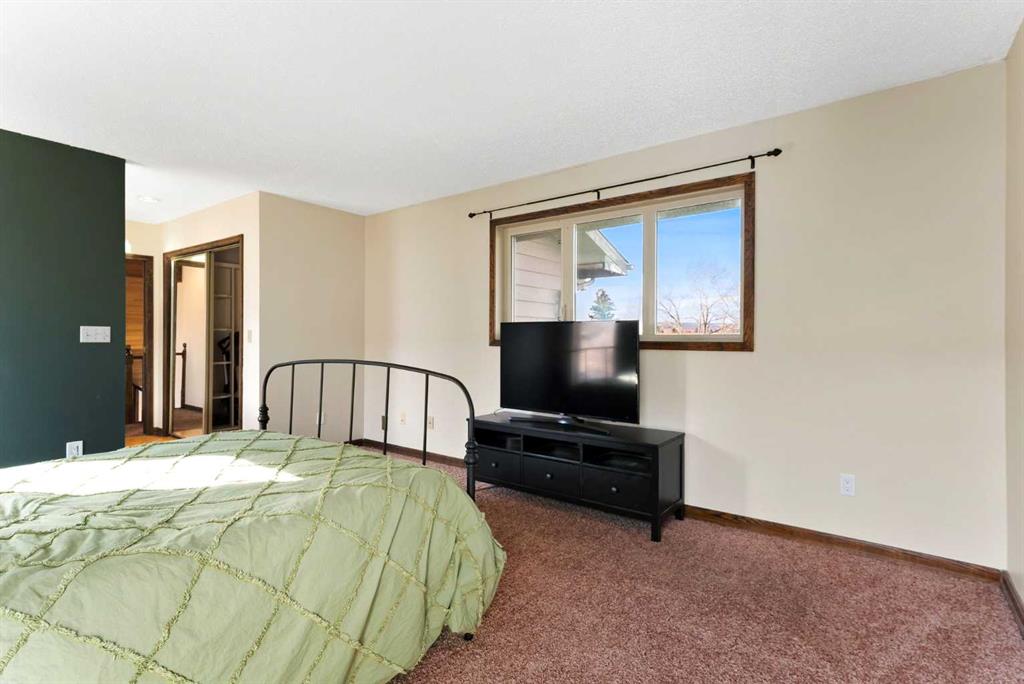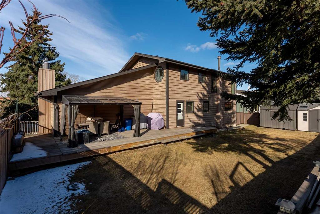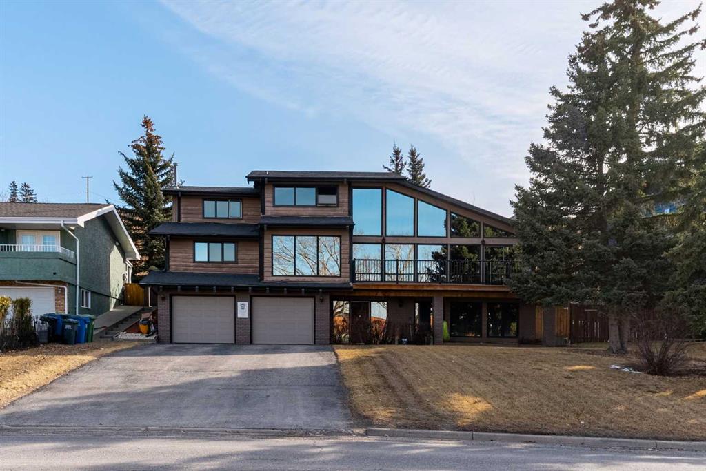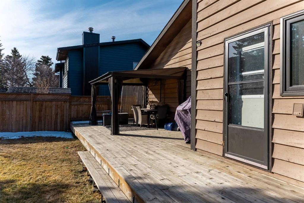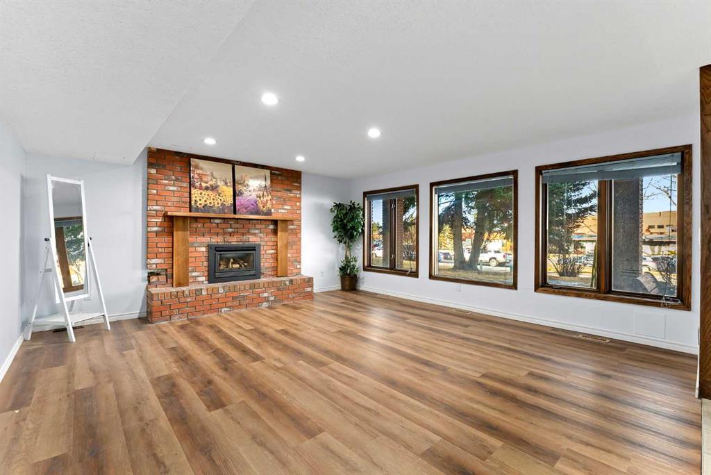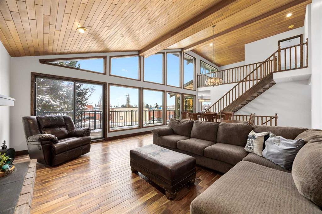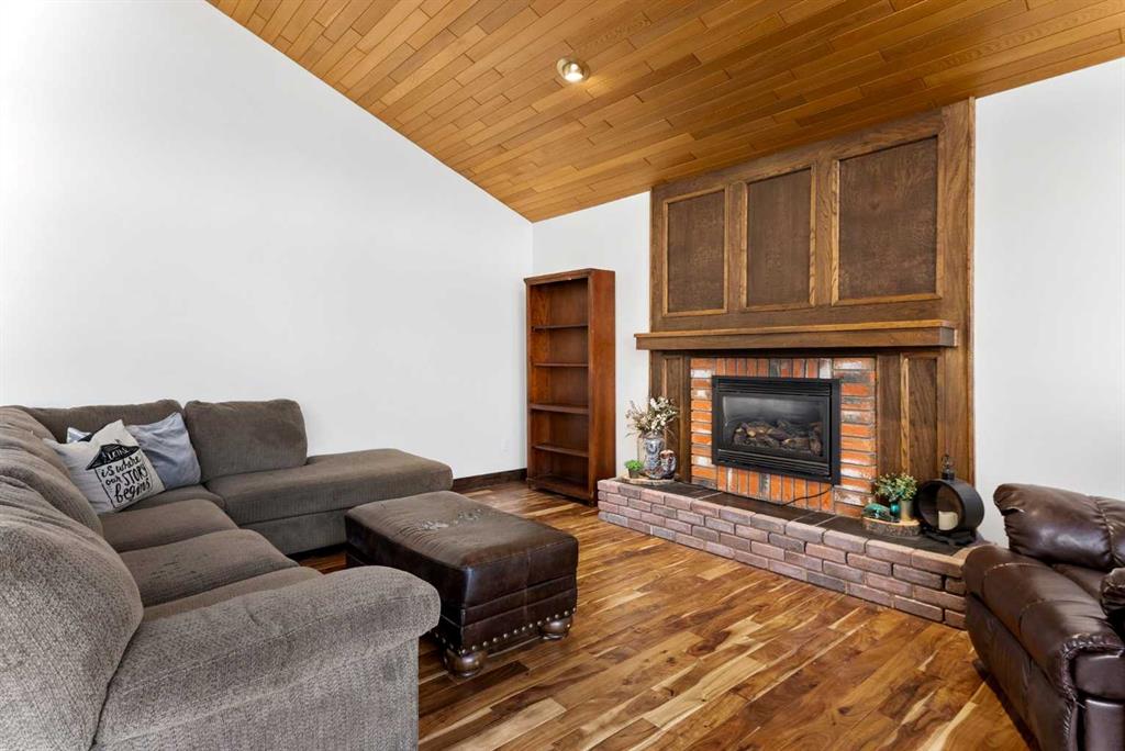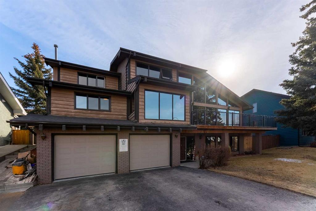 Set on a spacious 0.40-acre lot directly across from Cochrane’s tri-school site and indoor arena. This home is perfectly positioned for families; kids can walk to everything. Unique 1.5-storey reverse walkout offers 3 bedrooms and 2.5 bathrooms, combining comfort with a distinctive layout. The main entry welcomes you with a large, bright family room showcasing new luxury vinyl plank flooring and a cozy gas insert brick fireplace. Additional features include rough-in plumbing for a future wet bar, a convenient half bath with laundry, and direct access to the oversized 23′ x 23′ double attached heated garage, complete with durable epoxy floors. Upstairs, the main level showcases a spacious living and dining area with vaulted wood ceilings, a second gas fireplace, and a wall of tinted front windows plus sliding doors leading to the newly refurbished, wrap-around deck. Perfect for relaxing, entertaining, and taking in the surrounding mountain views. The kitchen is well-appointed with stainless steel appliances, granite countertops, under-mount lighting, an island, and a cozy breakfast nook with access to the deck, complete with gas line for BBQ. This level also includes two generously sized bedrooms, one featuring a Murphy bed, and a 5-piece bathroom with washer and dryer. A rear exit leads to a beautifully landscaped yard complete with patio, gazebo, and two storage sheds. The upper loft overlooks the main living space and is ideal for a home office, gym, or reading area. Adjacent is the primary suite, offering a walk-in closet, 4-piece ensuite, and lovely front and rear views of the property. Additional highlights include fresh paint and carpet, paved driveway with space for four vehicles, mature trees, and well-maintained landscaping. If you’re looking for a home with character, space, and an unbeatable location, this is it. Quick possession available.