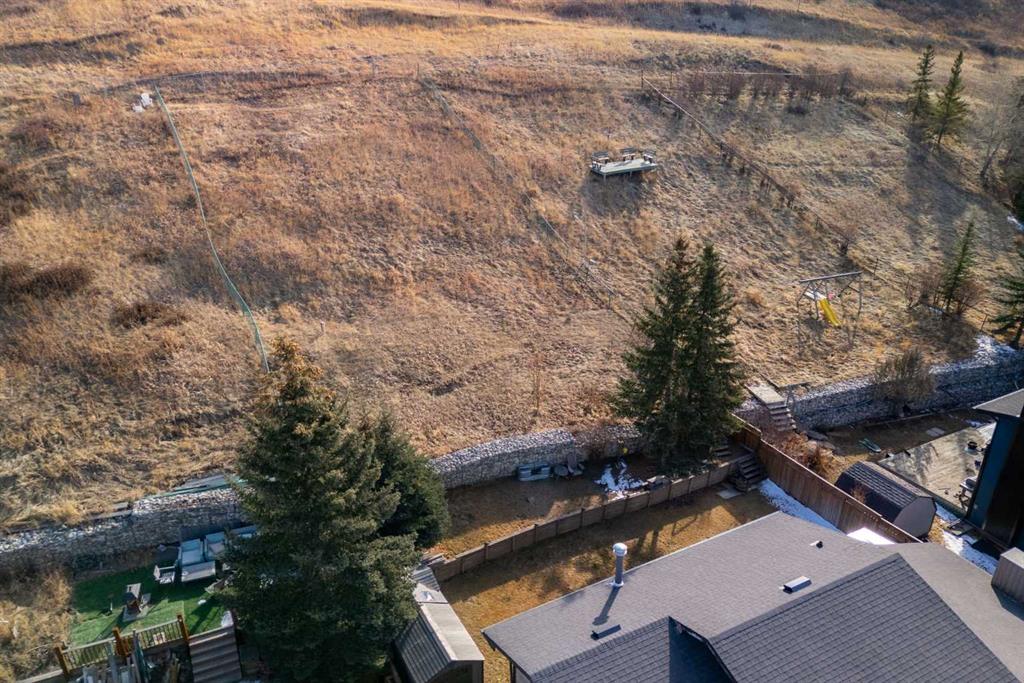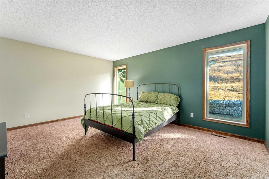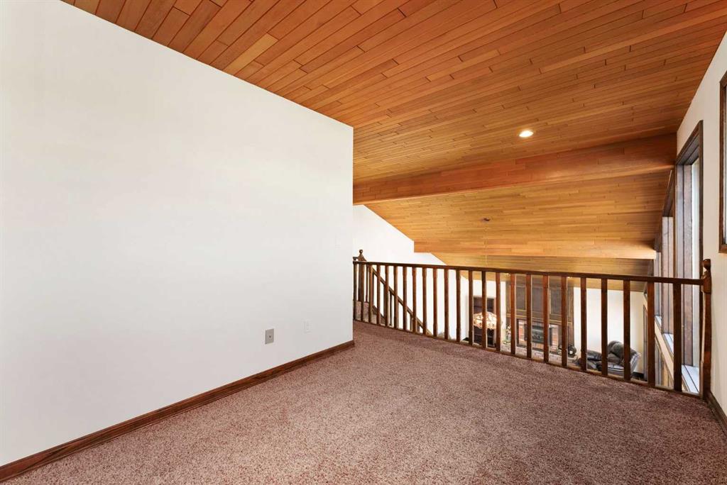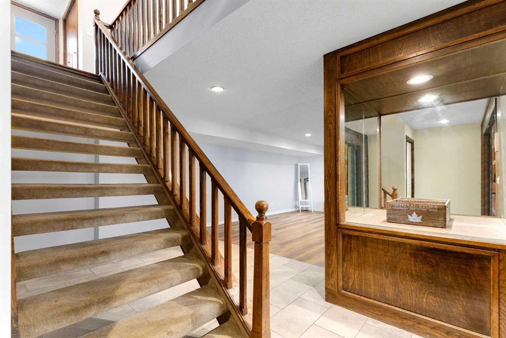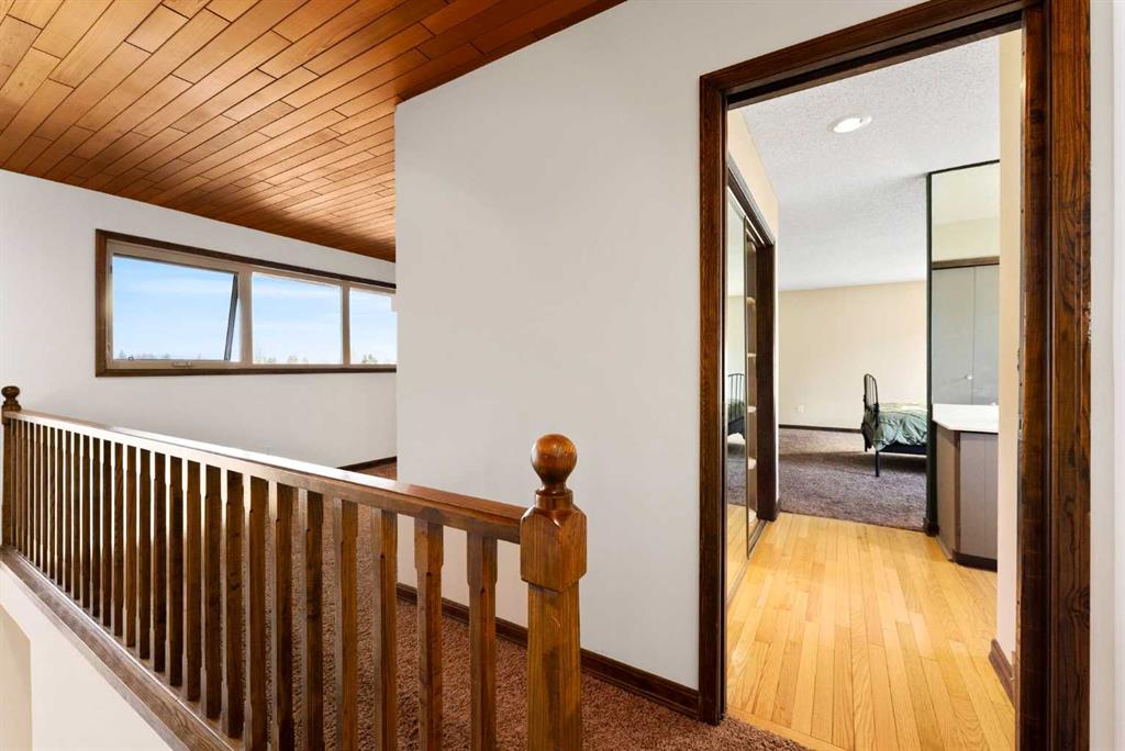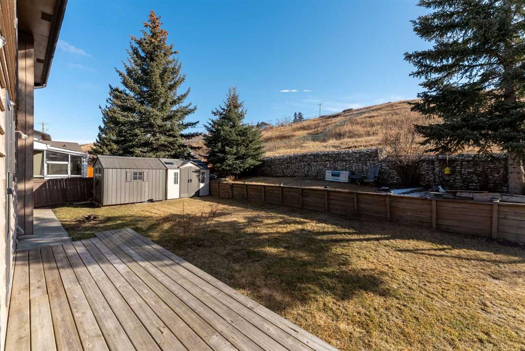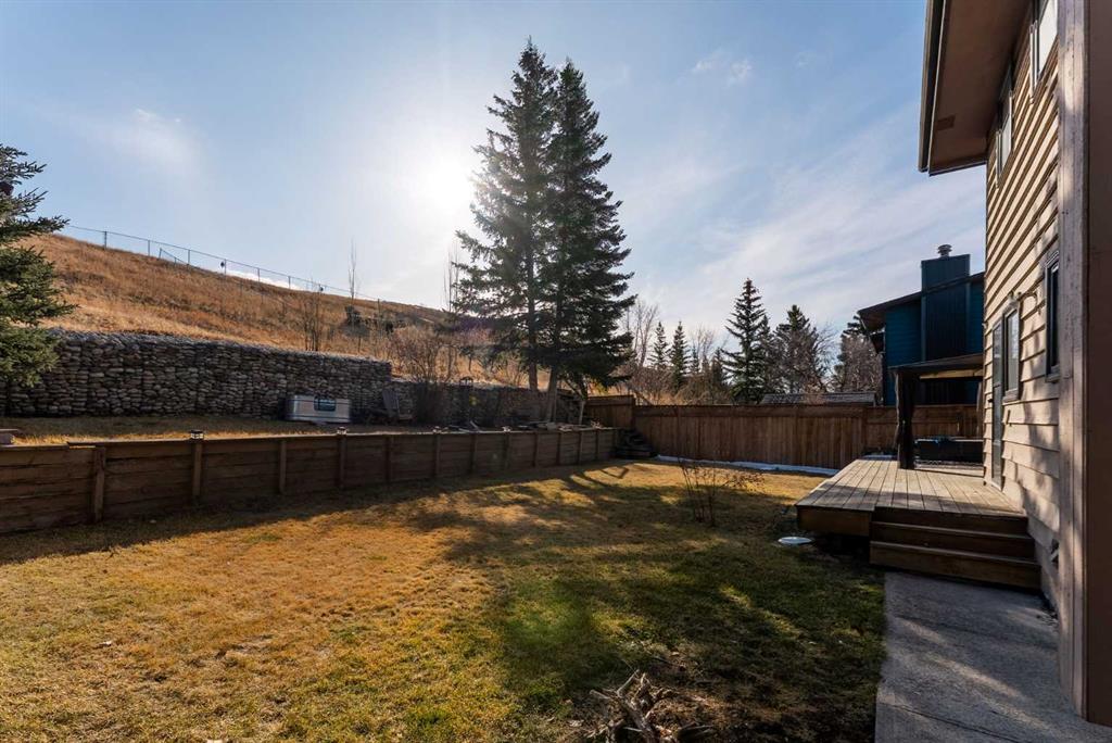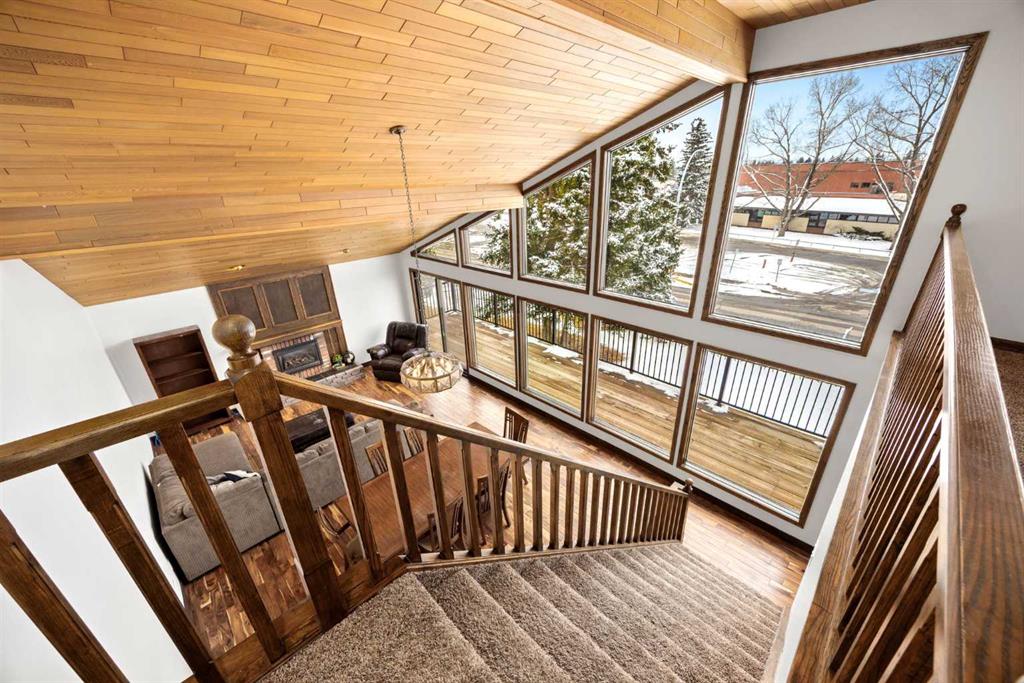Set on a spacious 0.40-acre lot directly across from Cochrane’s tri-school site and indoor arena. This home is perfectly positioned for families; kids can walk to everything. Unique 1.5-storey reverse walkout offers 3 bedrooms and 2.5 bathrooms, combining comfort with a distinctive layout. The main entry welcomes you with a large, bright family room showcasing new luxury vinyl plank flooring and a cozy gas insert brick fireplace. Additional features include rough-in plumbing for a future wet bar, a convenient half bath with laundry, and direct access to the oversized 23′ x 23′ double attached heated garage, complete with durable epoxy floors. Upstairs, the main level showcases a spacious living and dining area with vaulted wood ceilings, a second gas fireplace, and a wall of tinted front windows plus sliding doors leading to the newly refurbished, wrap-around deck. Perfect for relaxing, entertaining, and taking in the surrounding mountain views. The kitchen is well-appointed with stainless steel appliances, granite countertops, under-mount lighting, an island, and a cozy breakfast nook with access to the deck, complete with gas line for BBQ. This level also includes two generously sized bedrooms, one featuring a Murphy bed, and a 5-piece bathroom with washer and dryer. A rear exit leads to a beautifully landscaped yard complete with patio, gazebo, and two storage sheds. The upper loft overlooks the main living space and is ideal for a home office, gym, or reading area. Adjacent is the primary suite, offering a walk-in closet, 4-piece ensuite, and lovely front and rear views of the property. Additional highlights include fresh paint and carpet, paved driveway with space for four vehicles, mature trees, and well-maintained landscaping. If you’re looking for a home with character, space, and an unbeatable location, this is it. Quick possession available.
