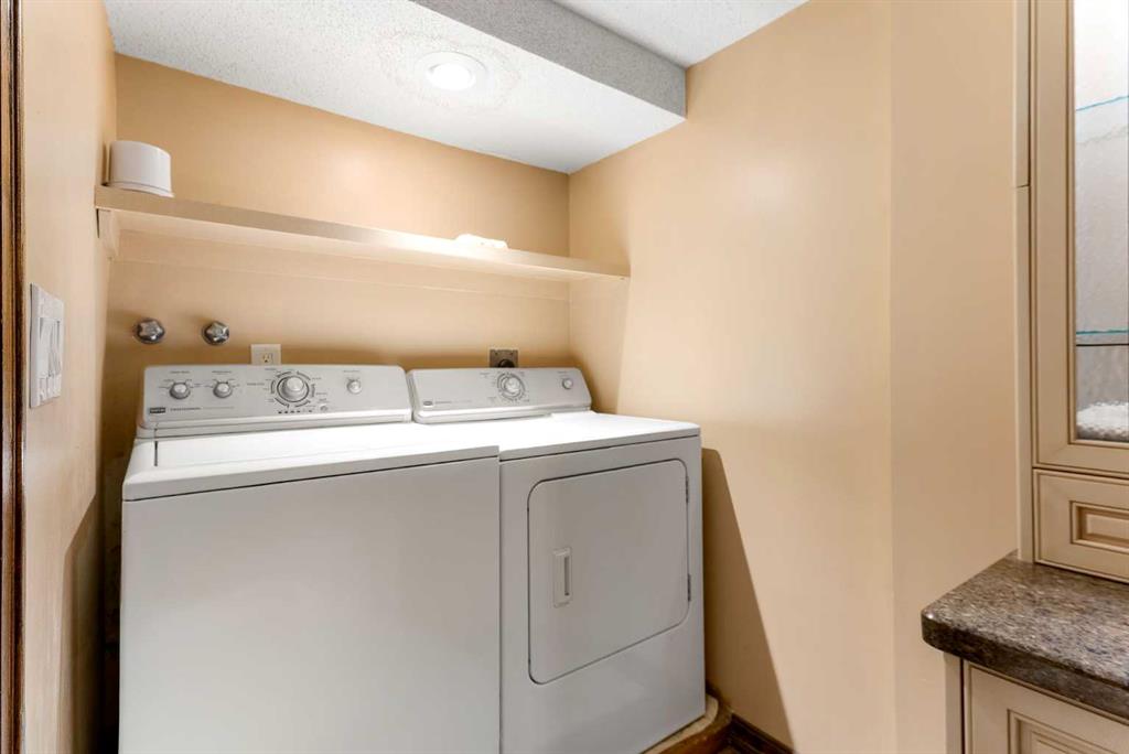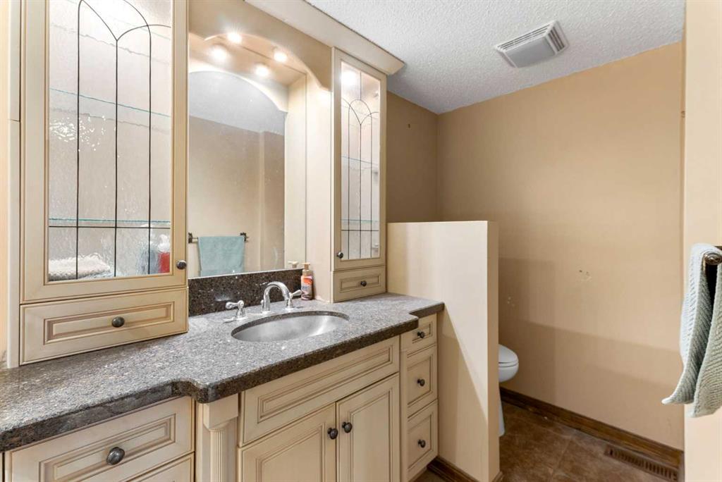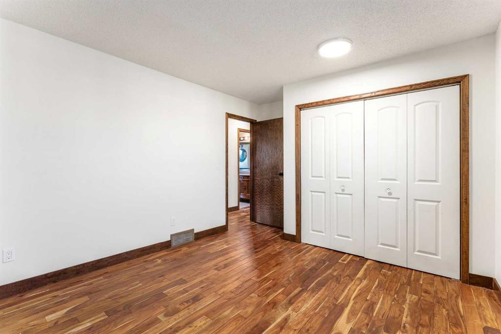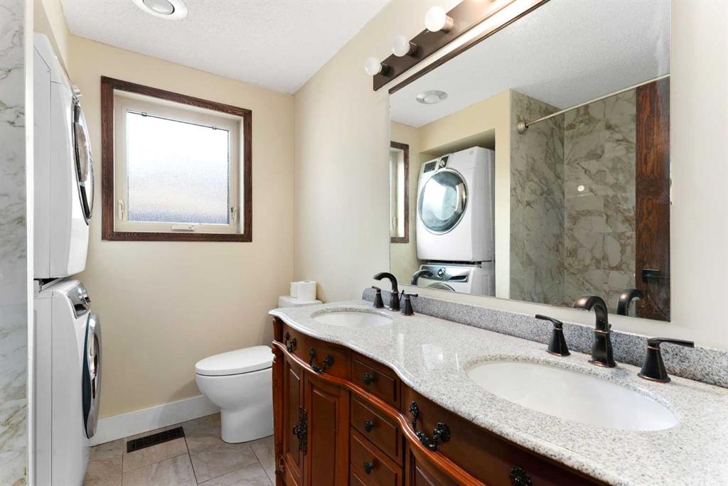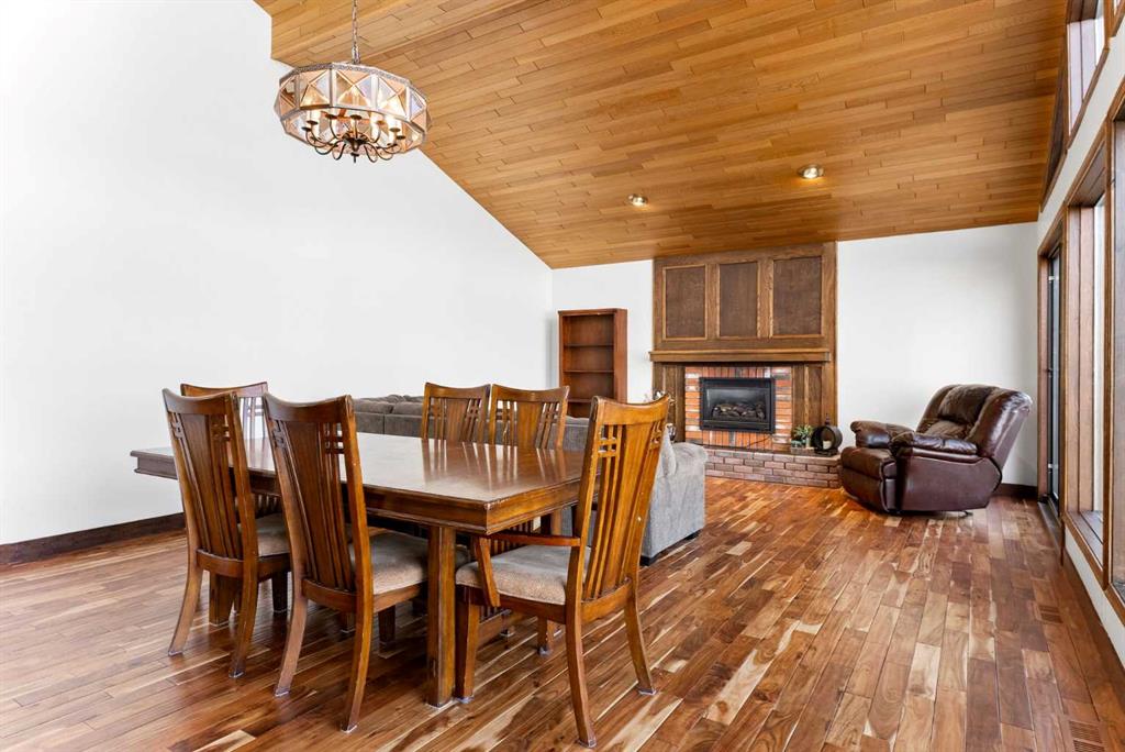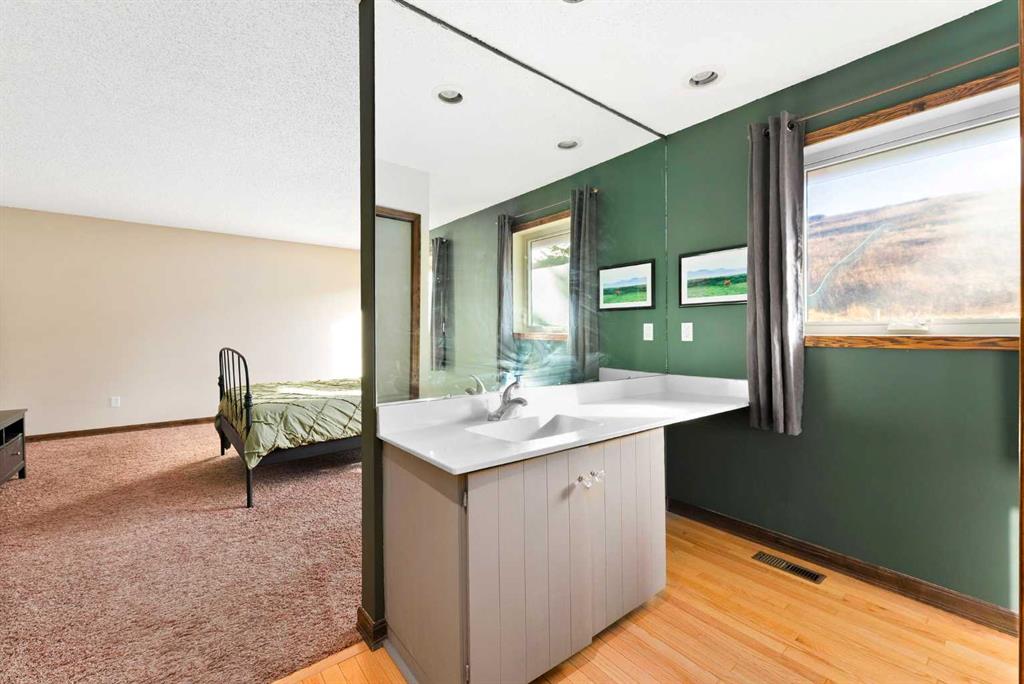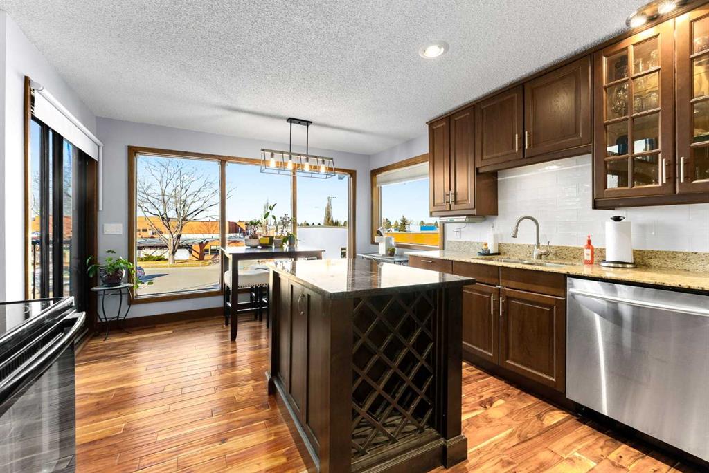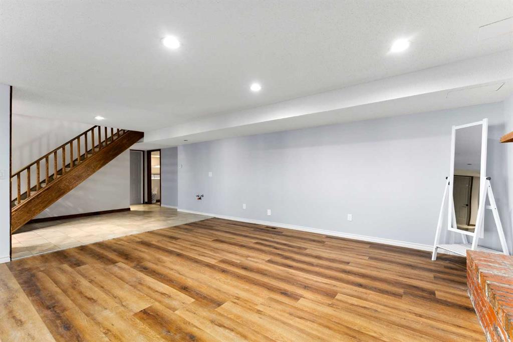 Set on a spacious 0.40-acre lot directly across from Cochrane’s tri-school site and indoor arena. This home is perfectly positioned for families; kids can walk to everything. Unique 1.5-storey reverse walkout offers 3 bedrooms and 2.5 bathrooms, combining comfort with a distinctive layout. The main entry welcomes you with a large, bright family room showcasing new luxury vinyl plank flooring and a cozy gas insert brick fireplace. Additional features include rough-in plumbing for a future wet bar, a convenient half bath with laundry, and direct access to the oversized 23′ x 23′ double attached heated garage, complete with durable epoxy floors. Upstairs, the main level showcases a spacious living and dining area with vaulted wood ceilings, a second gas fireplace, and a wall of tinted front windows plus sliding doors leading to the newly refurbished, wrap-around deck. Perfect for relaxing, entertaining, and taking in the surrounding mountain views. The kitchen is well-appointed with stainless steel appliances, granite countertops, under-mount lighting, an island, and a cozy breakfast nook with access to the deck, complete with gas line for BBQ. This level also includes two generously sized bedrooms, one featuring a Murphy bed, and a 5-piece bathroom with washer and dryer. A rear exit leads to a beautifully landscaped yard complete with patio, gazebo, and two storage sheds. The upper loft overlooks the main living space and is ideal for a home office, gym, or reading area. Adjacent is the primary suite, offering a walk-in closet, 4-piece ensuite, and lovely front and rear views of the property. Additional highlights include fresh paint and carpet, paved driveway with space for four vehicles, mature trees, and well-maintained landscaping. If you’re looking for a home with character, space, and an unbeatable location, this is it. Quick possession available.
