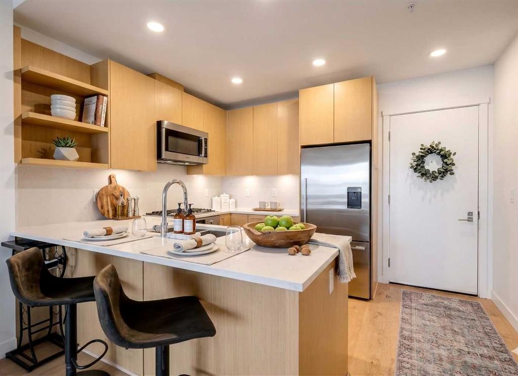 The amenities within the building act as an extension of the home, providing professional grade fitness spaces, spin and yoga studios, and a concierge service. The rooftop patio serves as a central gathering point with clear views of the downtown skyline. When it is time to commute, the Bridgeland/Memorial CTrain station is nearby, connecting you to the downtown core in minutes without the need for a car.