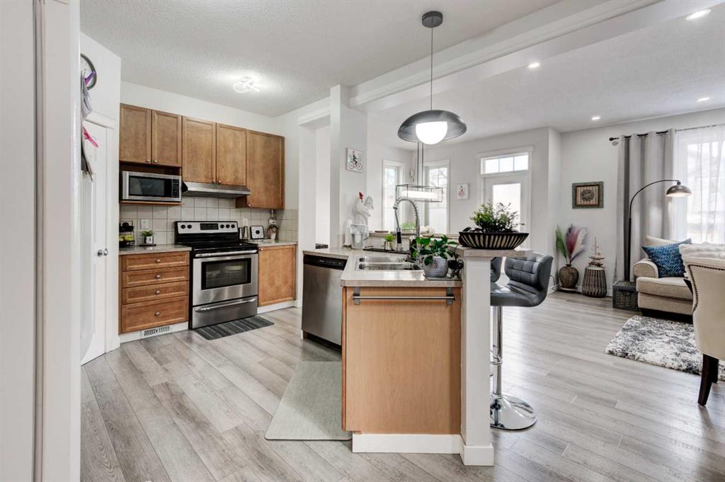 Welcome to beautiful 2- storey house , Conveniently situated across from a park in the family-oriented SW community of Bridlewood. With the open layout on the main floor, featuring a bright living room with a gas fireplace. The stylish kitchen with a large island boasting a breakfast bar, plenty of cabinet space, a walk-through pantry, and a welcoming dining /breakfast nook. Laundry room and a 2- piece bath also located in the main floor. Upstairs, the primary suite offers ample space, complete with a large walk-in closet and a 4 -piece ensuite bathroom featuring a stand-up shower and a relaxing soaker tub. The upper level also includes a charming bonus room with vaulted ceilings , 2 additional bedrooms, an office space, and an updated 3-piece bath. The fully finished lower level provides flexibility with a recreation room, 2 additional bedrooms, a den/office, Dining room/servery. Step outside to the oversized , landscaped backyard, siding onto a walking path, and featuring a 2-tiered deck with a convenient gas hookup and a storage shed. Features includes a double attached garage, and recent upgrade like flooring. Previous owner ,in 2023 or before , has done the upgrades like new siding, roof, garage door, washer/dryer, and dishwasher. Conveniently located close to all amenities, including shopping, public transportation, parks, schools, and major roads, This house delivers great value. Book your private viewing today!