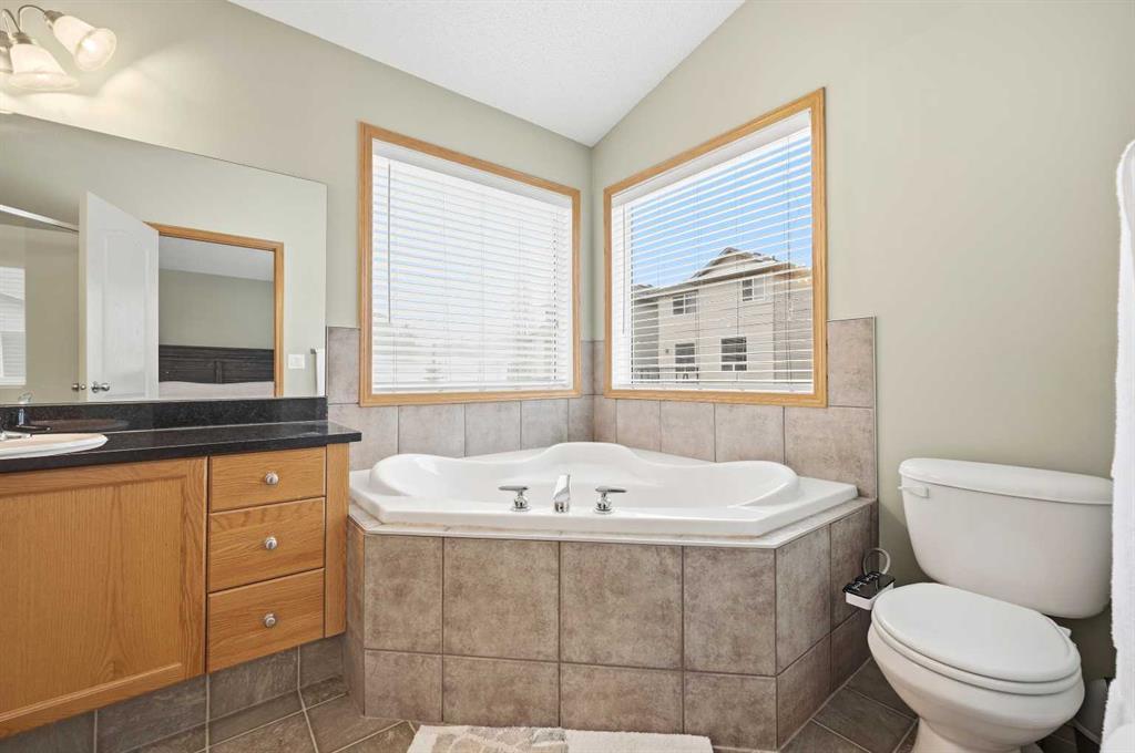 Upstairs, families will love the spacious **bonus room**—ideal for a playroom, movie nights, or homework space. The **upper-level laundry** adds everyday convenience. The **primary bedroom** offers a relaxing retreat with a walk-in closet and private ensuite featuring a **soaker tub, separate shower, and granite countertops**. Two additional well-sized bedrooms and a full bathroom complete the upper level.