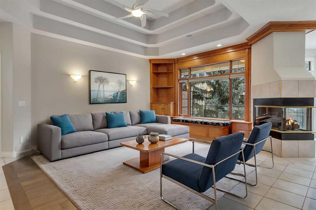 Welcome to this beautifully renovated 1,605 sq. ft. fully finished walkout bungalow in the highly desirable Sandstone community of Okotoks. Offering exceptional craftsmanship, thoughtful design, and pride of ownership throughout, this home truly stands out. From the moment you arrive, you’ll notice the attention to detail. The spacious front entry welcomes you into an impressive open-concept main floor featuring gleaming hardwood floors, 9-foot ceilings, and a dramatic tiered cathedral ceiling in the great room. Large windows flood the space with natural light, while a striking three-sided fireplace creates warmth and elegance between the living , kitchen and dining areas. The custom kitchen is a true showpiece, complete with a massive island, porcelain countertops, solid wood cabinetry, high-end built-in appliances, a butler’s pantry with sink, and a convenient walk-through pantry. The bright nook area leads to a full-sized deck — perfect for entertaining or relaxing outdoors. In addition to the primary retreat, the main floor also features a private den — ideal for a home office, library, or flex space. The spacious primary bedroom offers a walk-in closet with custom built-ins and a luxurious ensuite. Main floor laundry adds everyday convenience. The fully developed walkout basement is equally impressive, featuring in-floor heating, a beautiful built-in fireplace with custom cabinetry, and a spacious family/games room complete with a wet bar — perfect for entertaining. Two generous bedrooms (both with walk-in closets) and a full bathroom complete the lower level. Large windows provide abundant natural light, creating a warm and inviting space. A truly special feature of this property is the separate, private guest accommodation (illegal suite), complete with its own entrance, kitchen, stacked washer and dryer, bedroom, and full bathroom — ideal for extended family, guests, or potential Airbnb use. Additional highlights include a heated garage, mature trees, a private yard, and direct access to walking and biking paths. Located close to schools, amenities, transportation, and serene green spaces. This exceptional home offers luxury, flexibility, and an unbeatable location — a rare opportunity!