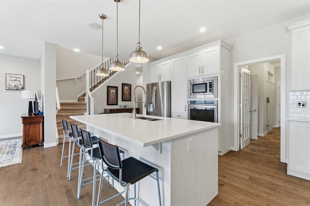 Imagine a home where your backyard opens to a vast, serene greenspace with future park plans. Tucked in a quiet cul-de-sac, 52 Walden Green SE is a modern sanctuary designed for both connection and focus.The main level features a private office with a door and a chef’s kitchen equipped with an extra-large island, gas cooktop, and in-wall oven. Relax by the floor-to-ceiling tile gas fireplace or enjoy the peaceful views from your house-width balcony.Upstairs, find a vaulted bonus room wired for sound—the perfect spot for family movie nights. The primary suite is a true retreat with a 5-piece ensuite and a huge walk-in closet. Two additional large bedrooms share a clever bathroom with double sinks and a separate privacy door.The light-filled walk-out level offers incredible flexibility with its own separate entrance and lighted side walkway. This space includes a large bedroom, a den with a barn door, and a 3-piece bath with cozy in-floor heating. With rough-ins for a kitchen and second laundry, it is ideal for guests or multi-generational living.The landscaped backyard is designed for making memories, featuring a covered patio, a storage shed, and a dedicated BBQ pit for entertaining. Total living area: 3411 sq.ft.