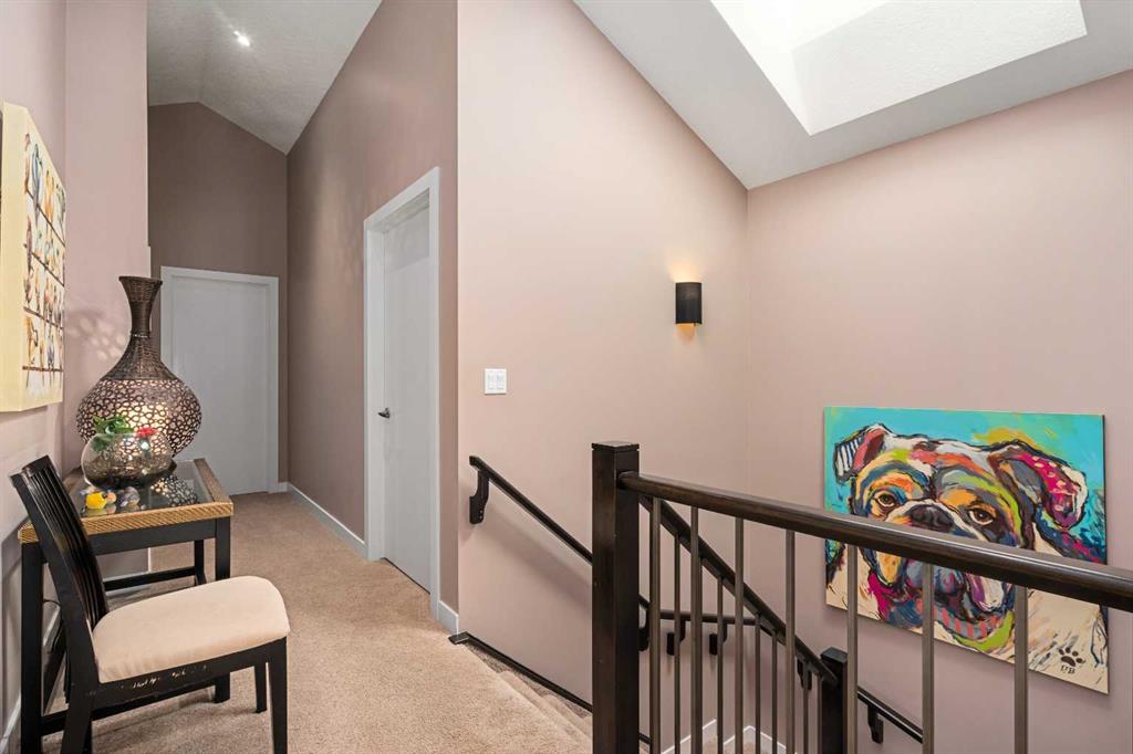 Upstairs, vaulted ceilings enhance the bright and airy feel. The spacious primary retreat features a large walk-in closet, silk channel-set drapery, and a luxurious 5-piece ensuite complete with two skylights, filling the space with natural light. Additional bedrooms are well-appointed and ideal for family living.